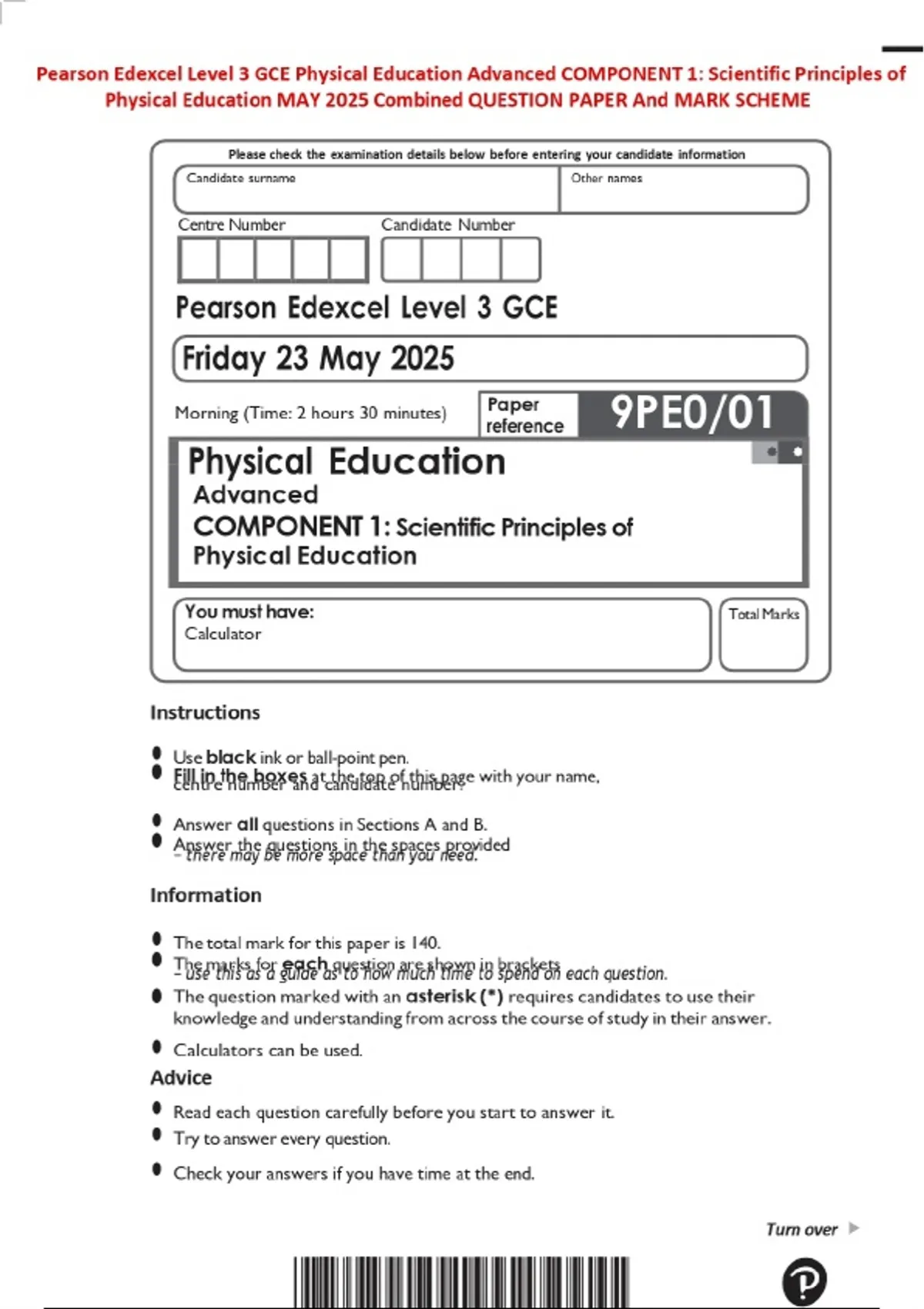 Pearson Edexcel Level 3 GCE Physical Education Advanced COMPONENT 1: Scientific Principles of Physical Education MAY 2025 Combined QUESTION PAPER And MARK SCHEME