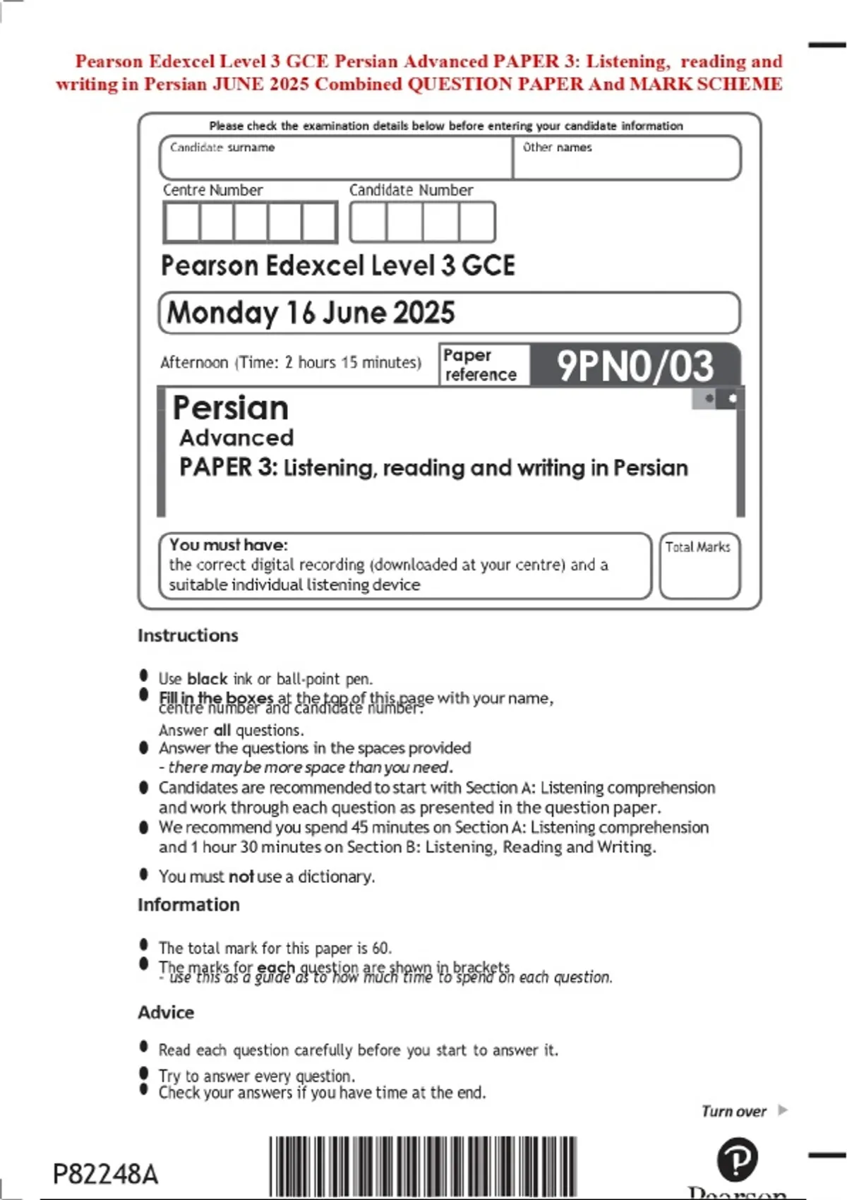 Pearson Edexcel Level 3 GCE Persian Advanced PAPER 3: Listening, reading and writing in Persian JUNE 2025 Combined QUESTION PAPER And MARK SCHEME