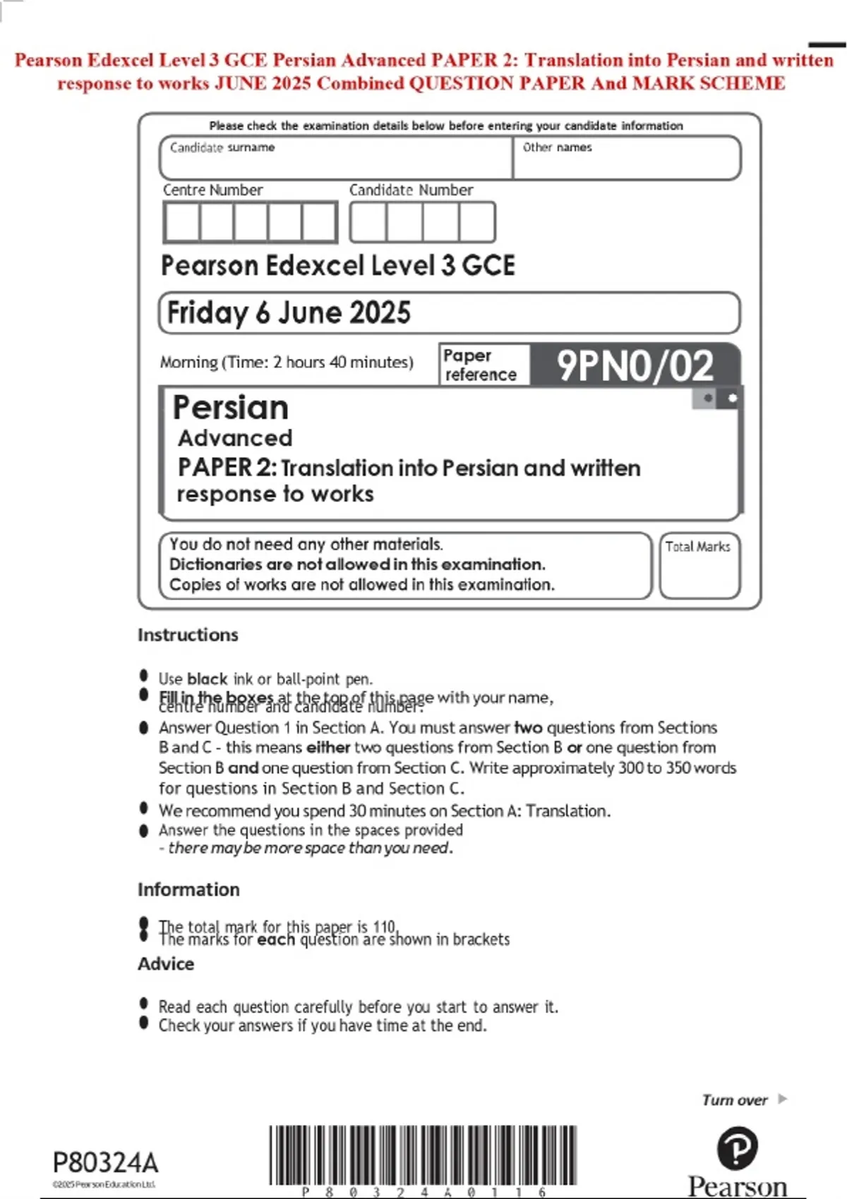 Pearson Edexcel Level 3 GCE Persian Advanced PAPER 2: Translation into Persian and written response to works JUNE 2025 Combined QUESTION PAPER And MARK SCHEME