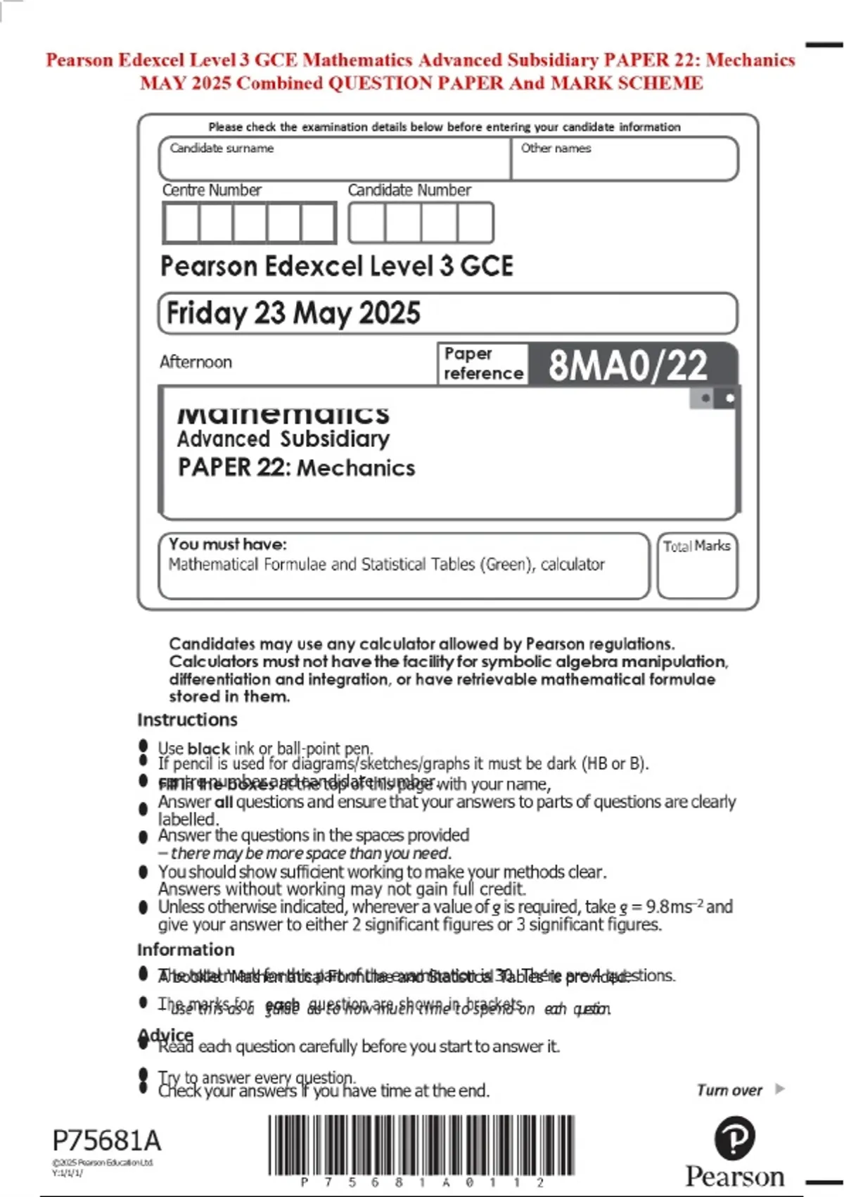 Pearson Edexcel Level 3 GCE Mathematics Advanced Subsidiary PAPER 22: Mechanics MAY 2025 Combined QUESTION PAPER And MARK SCHEME