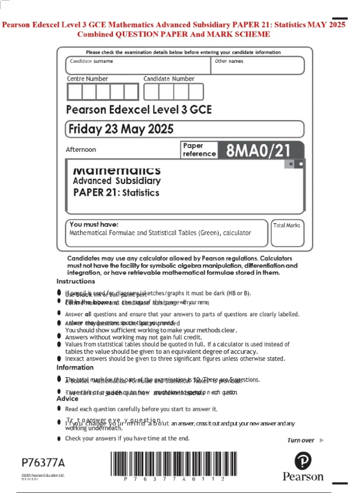 Pearson Edexcel Level 3 GCE Mathematics Advanced Subsidiary PAPER 21: Statistics MAY 2025 Combined QUESTION PAPER And MARK SCHEME