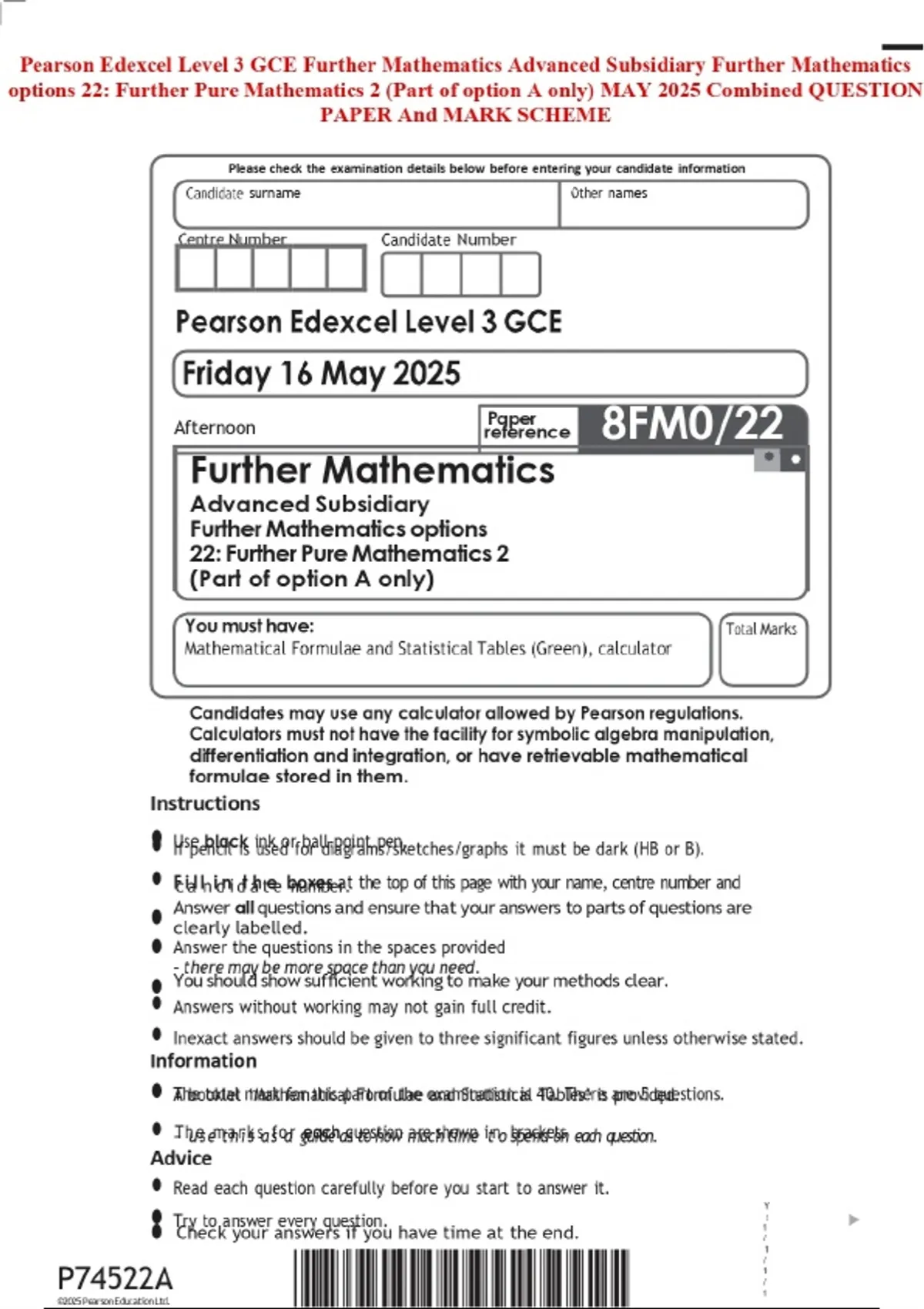 Pearson Edexcel Level 3 GCE Further Mathematics Advanced Subsidiary Further Mathematics options 22: Further Pure Mathematics 2 (Part of option A only) MAY 2025 Combined QUESTION PAPER And MARK SCHEME