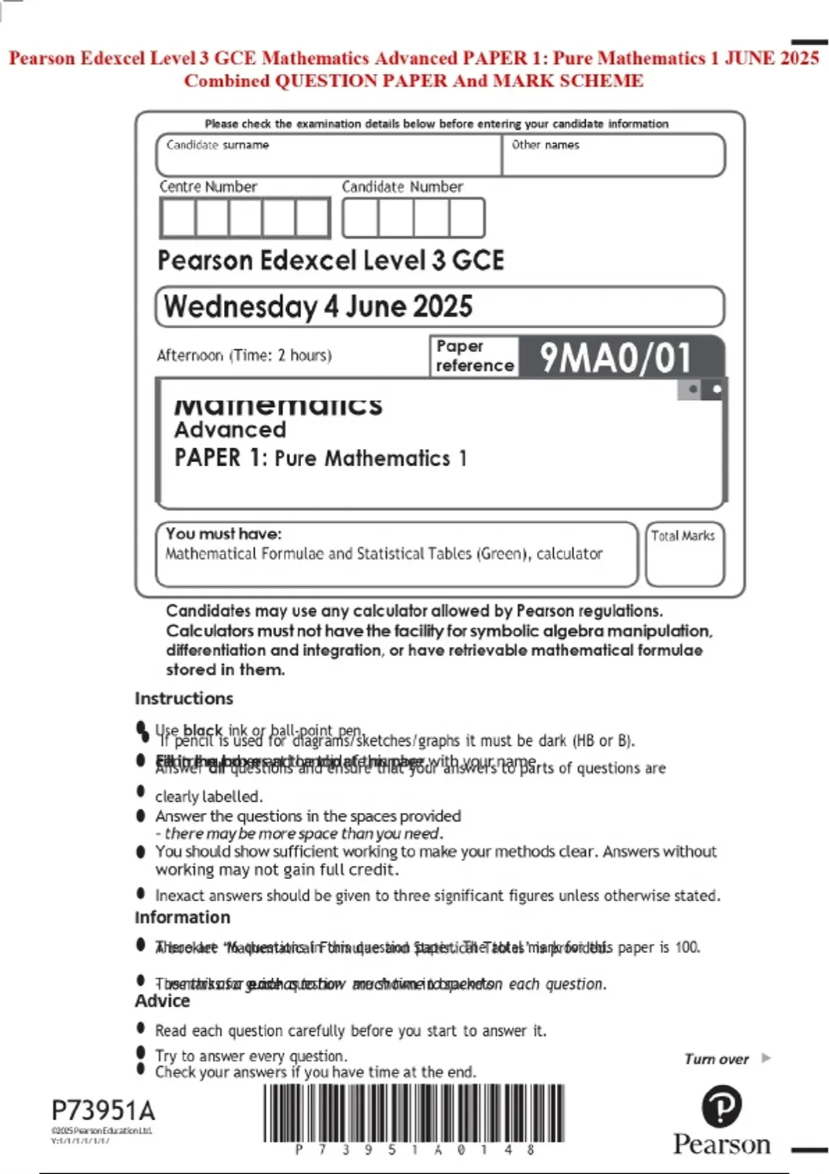 Pearson Edexcel Level 3 GCE Mathematics Advanced PAPER 1: Pure Mathematics 1 JUNE 2025 Combined QUESTION PAPER And MARK SCHEME