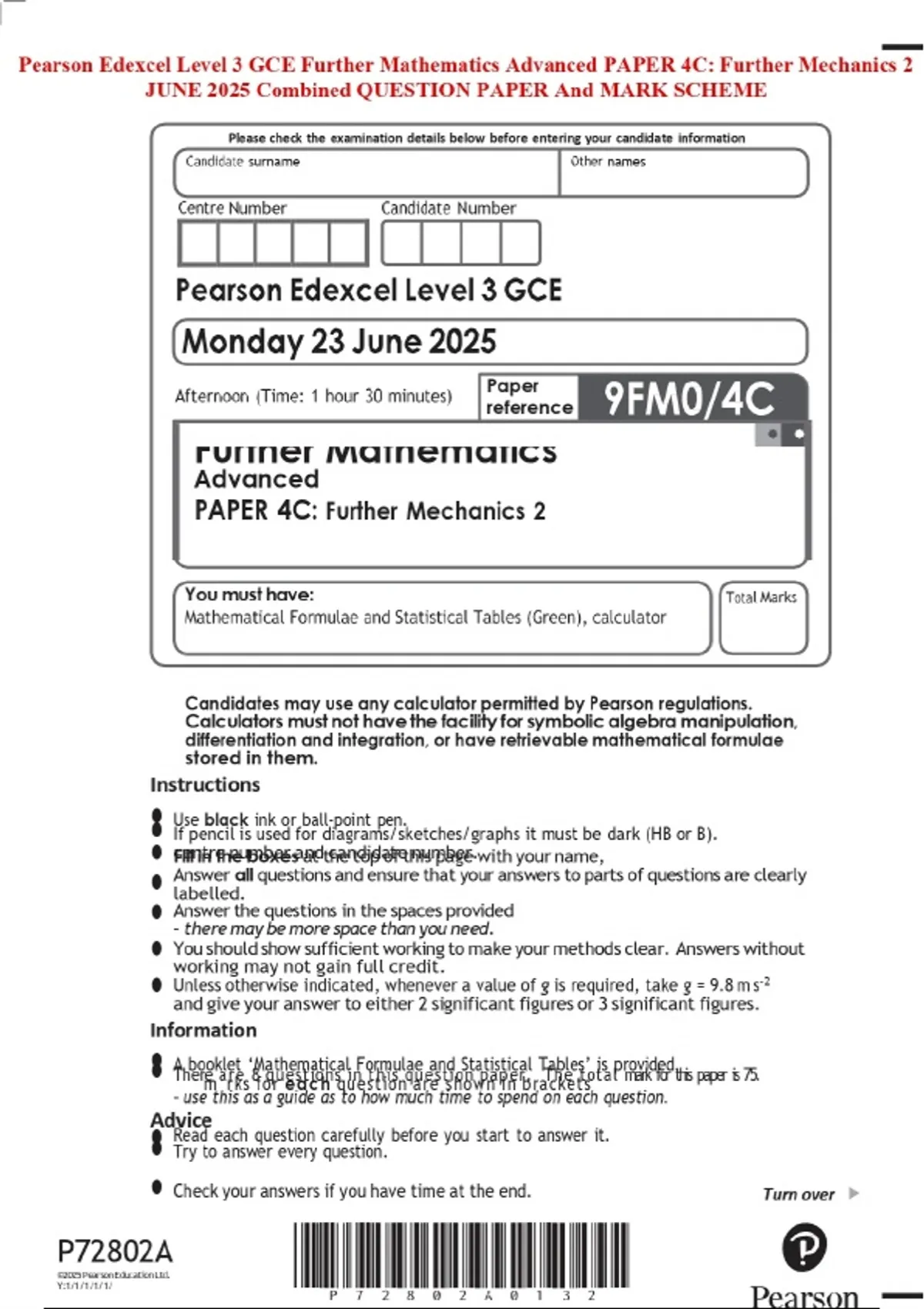 Pearson Edexcel Level 3 GCE Further Mathematics Advanced PAPER 4C: Further Mechanics 2 JUNE 2025 Combined QUESTION PAPER And MARK SCHEME