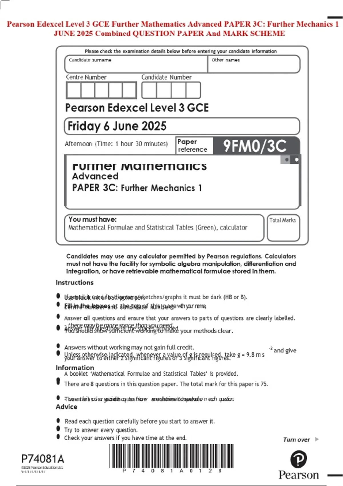 Pearson Edexcel Level 3 GCE Further Mathematics Advanced PAPER 3C: Further Mechanics 1 JUNE 2025 Combined QUESTION PAPER And MARK SCHEME