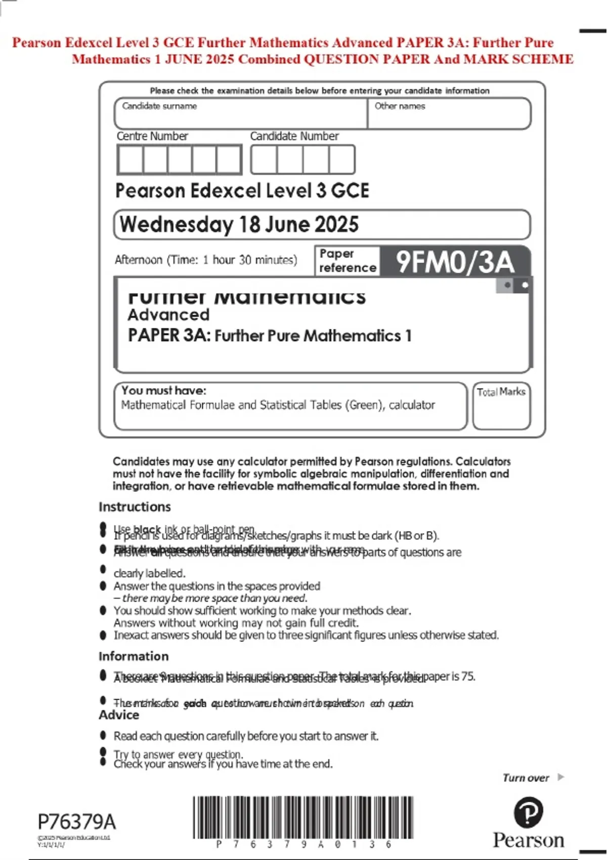 Pearson Edexcel Level 3 GCE Further Mathematics Advanced PAPER 3A: Further Pure Mathematics 1 JUNE 2025 Combined QUESTION PAPER And MARK SCHEME