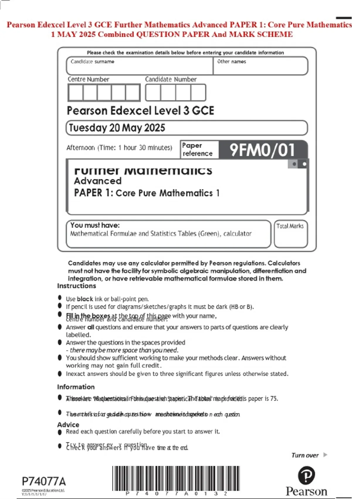 Pearson Edexcel Level 3 GCE Further Mathematics Advanced PAPER 1: Core Pure Mathematics1 MAY 2025 Combined QUESTION PAPER And MARK SCHEME
