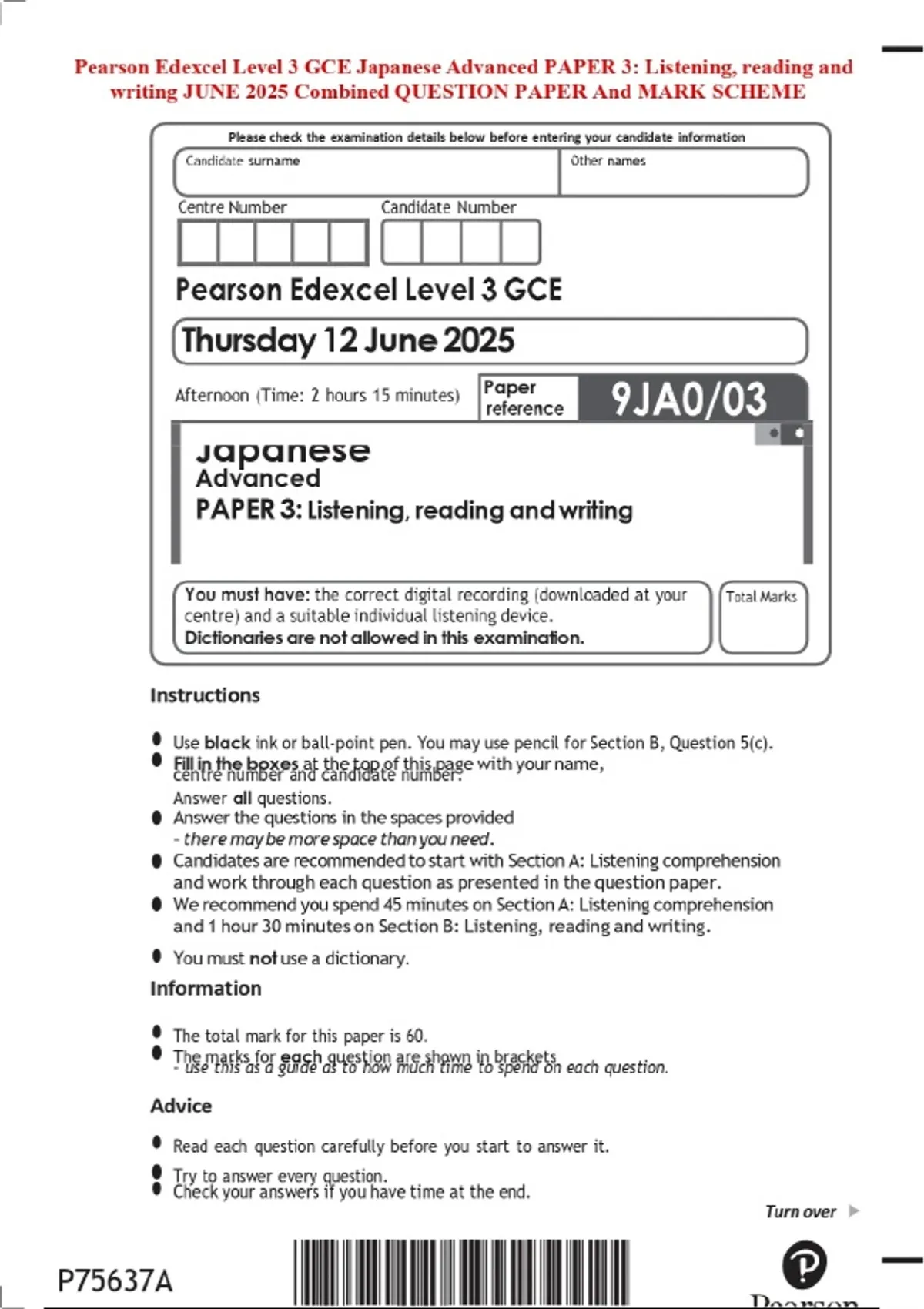 Pearson Edexcel Level 3 GCE Japanese Advanced PAPER 3: Listening, reading and writing JUNE 2025 Combined QUESTION PAPER And MARK SCHEME
