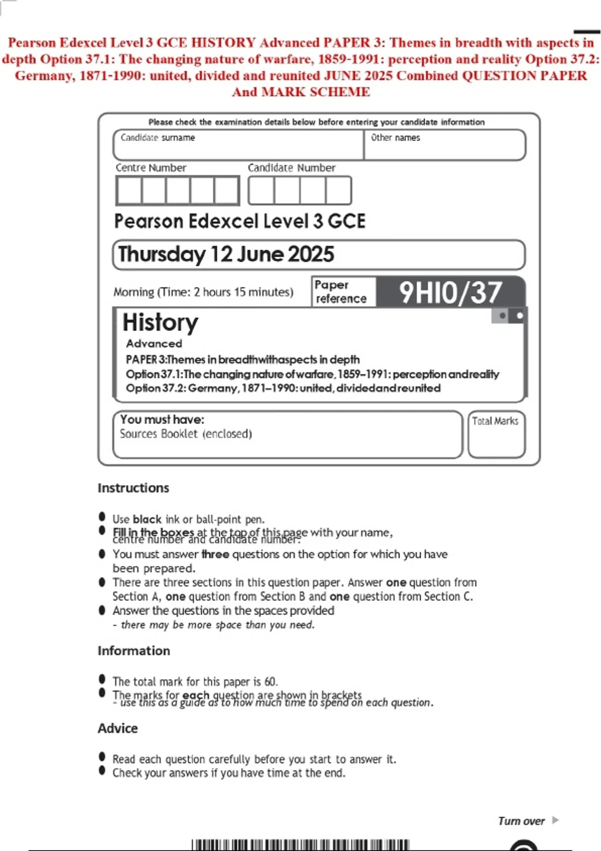 Pearson Edexcel Level 3 GCE HISTORY Advanced PAPER 3: Themes in breadth with aspects in depth Option 37.1: The changing nature of warfare, 1859–1991: perception and reality Option 37.2: Germany, 1871–1990: united, divided and reunited JUNE 2025 Combined QUESTION PAPER And MARK SCHEME