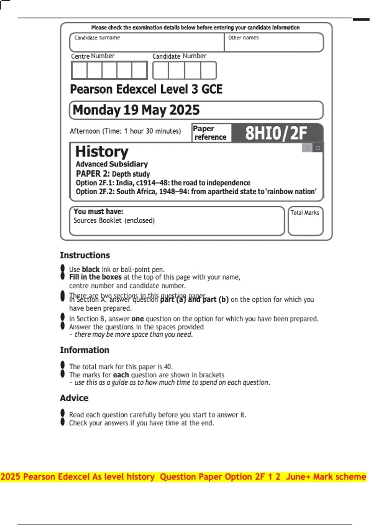 2025 Pearson Edexcel As level history Question Paper Option 2F 1 2 June+ Mark scheme