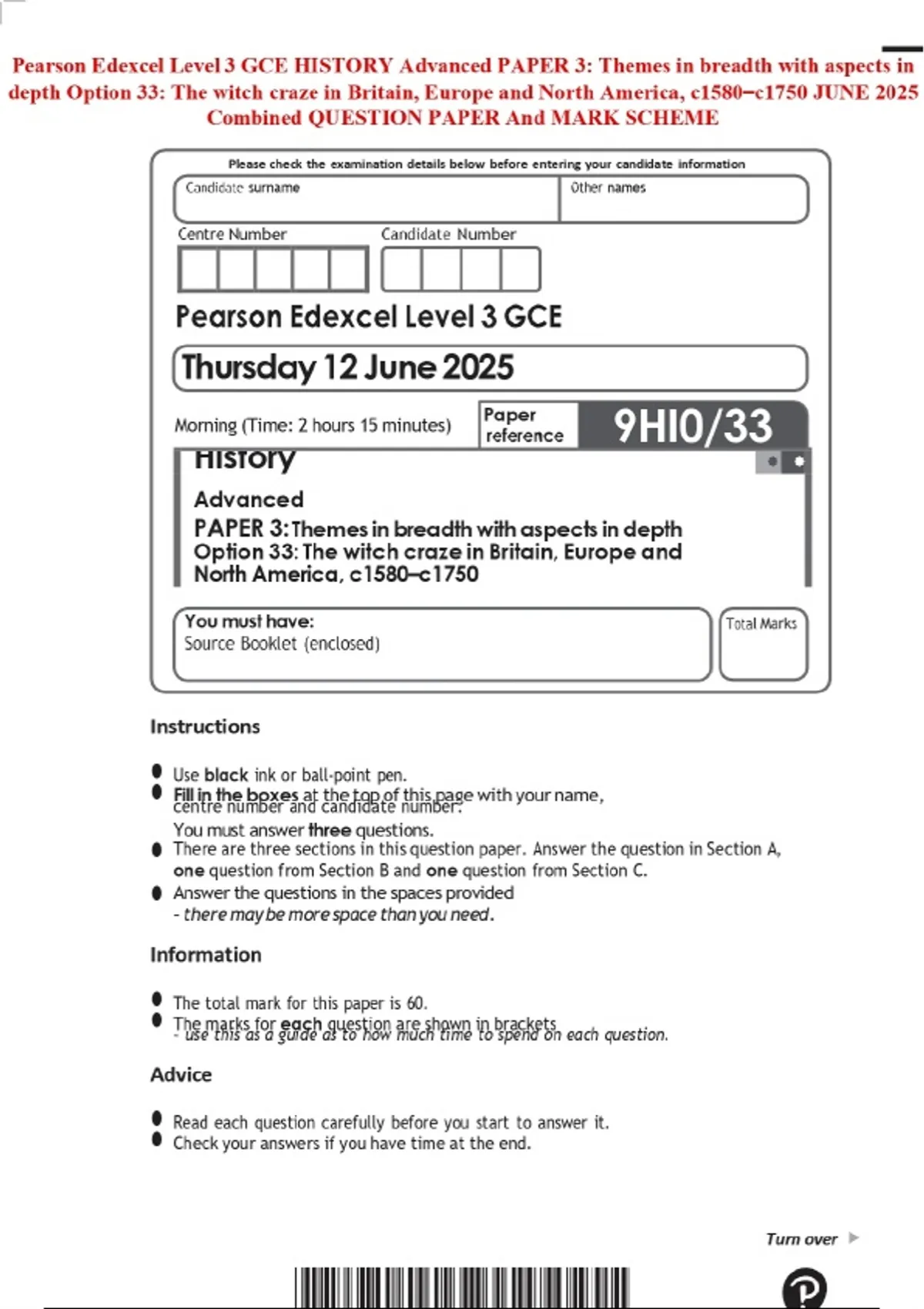Pearson Edexcel Level 3 GCE HISTORY Advanced PAPER 3: Themes in breadth with aspects in depth Option 33: The witch craze in Britain, Europe and North America, c1580–c1750 JUNE 2025 Combined QUESTION PAPER And MARK SCHEME