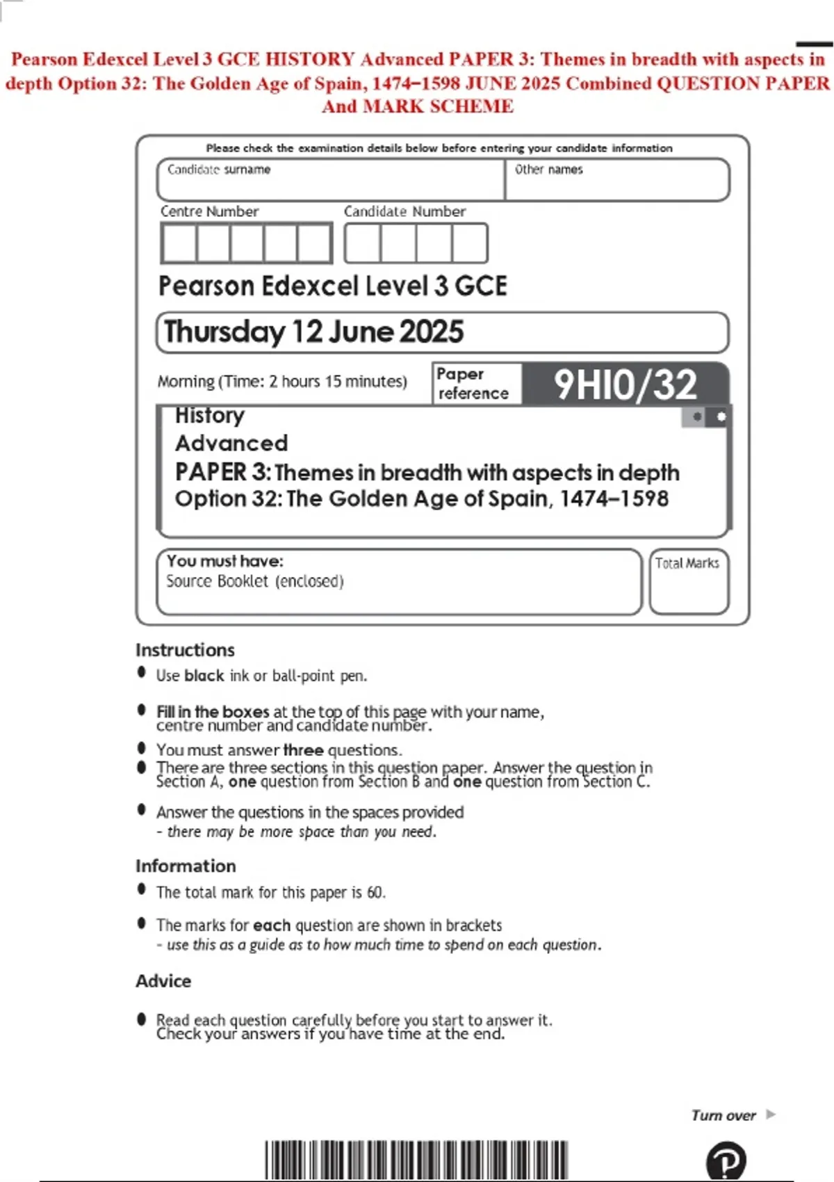 Pearson Edexcel Level 3 GCE HISTORY Advanced PAPER 3: Themes in breadth with aspects in depth Option 32: The Golden Age of Spain, 1474–1598 JUNE 2025 Combined QUESTION PAPER And MARK SCHEME
