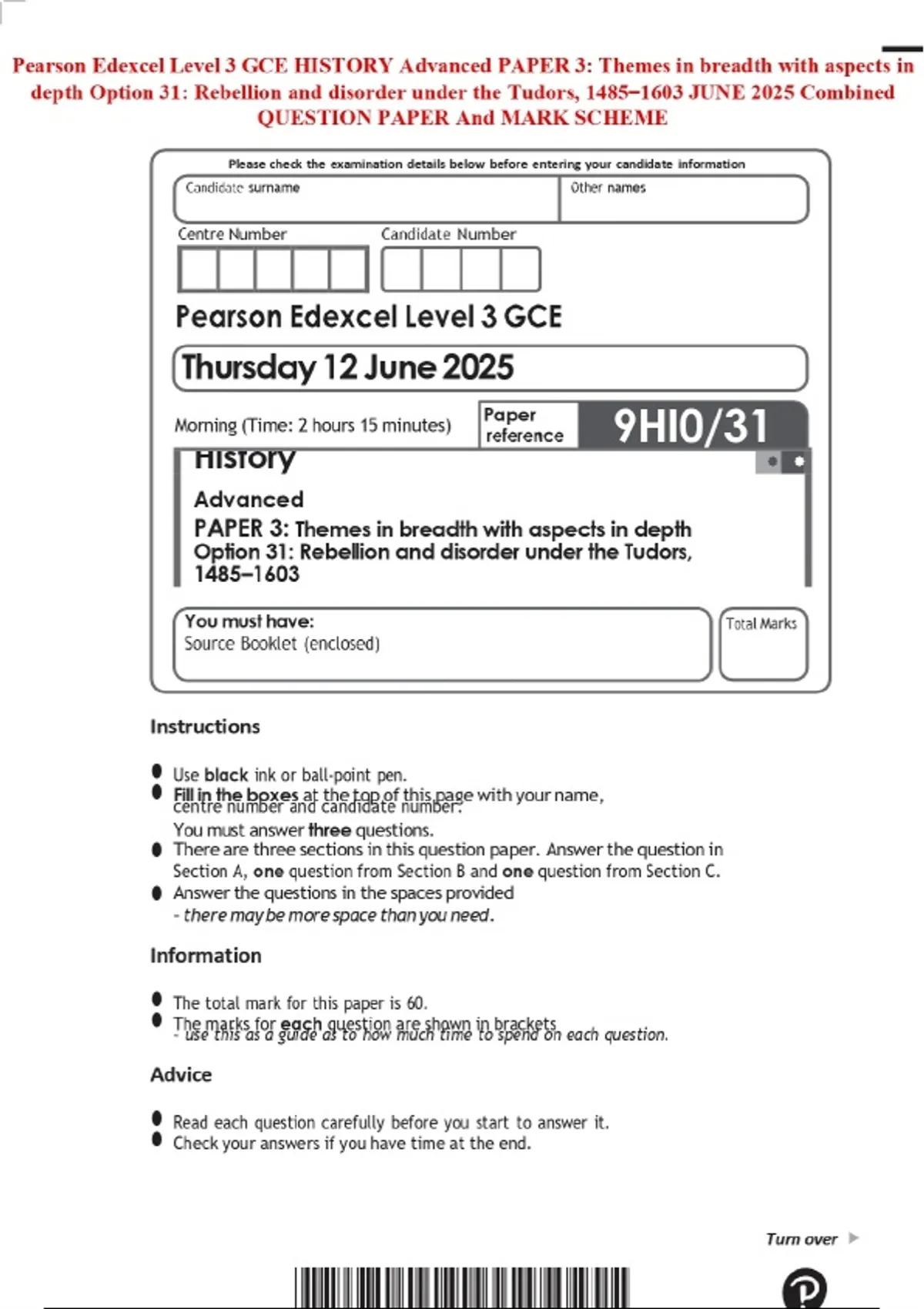 Pearson Edexcel Level 3 GCE HISTORY Advanced PAPER 3: Themes in breadth with aspects in depth Option 31: Rebellion and disorder under the Tudors, 1485–1603 JUNE 2025 Combined QUESTION PAPER And MARK SCHEME