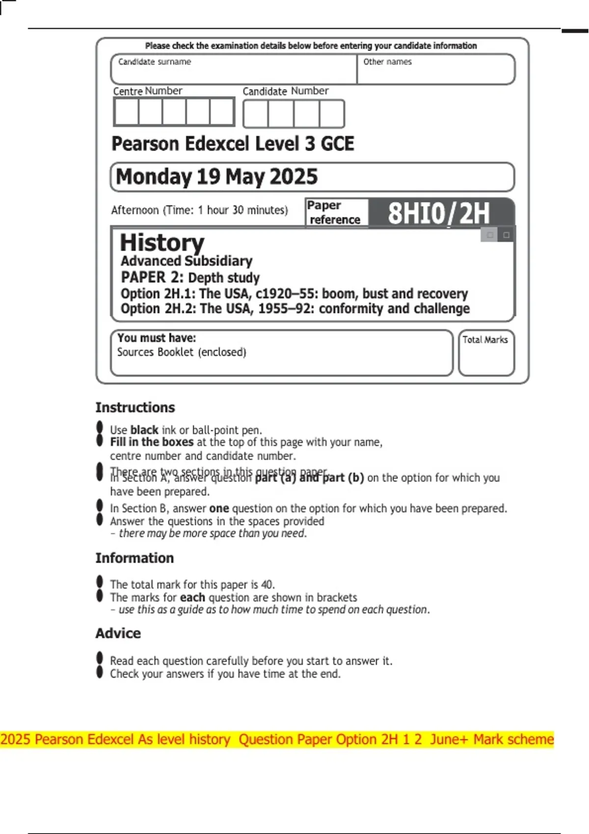 2025 Pearson Edexcel As level history Question Paper Option 2H 1 2 June+ Mark scheme