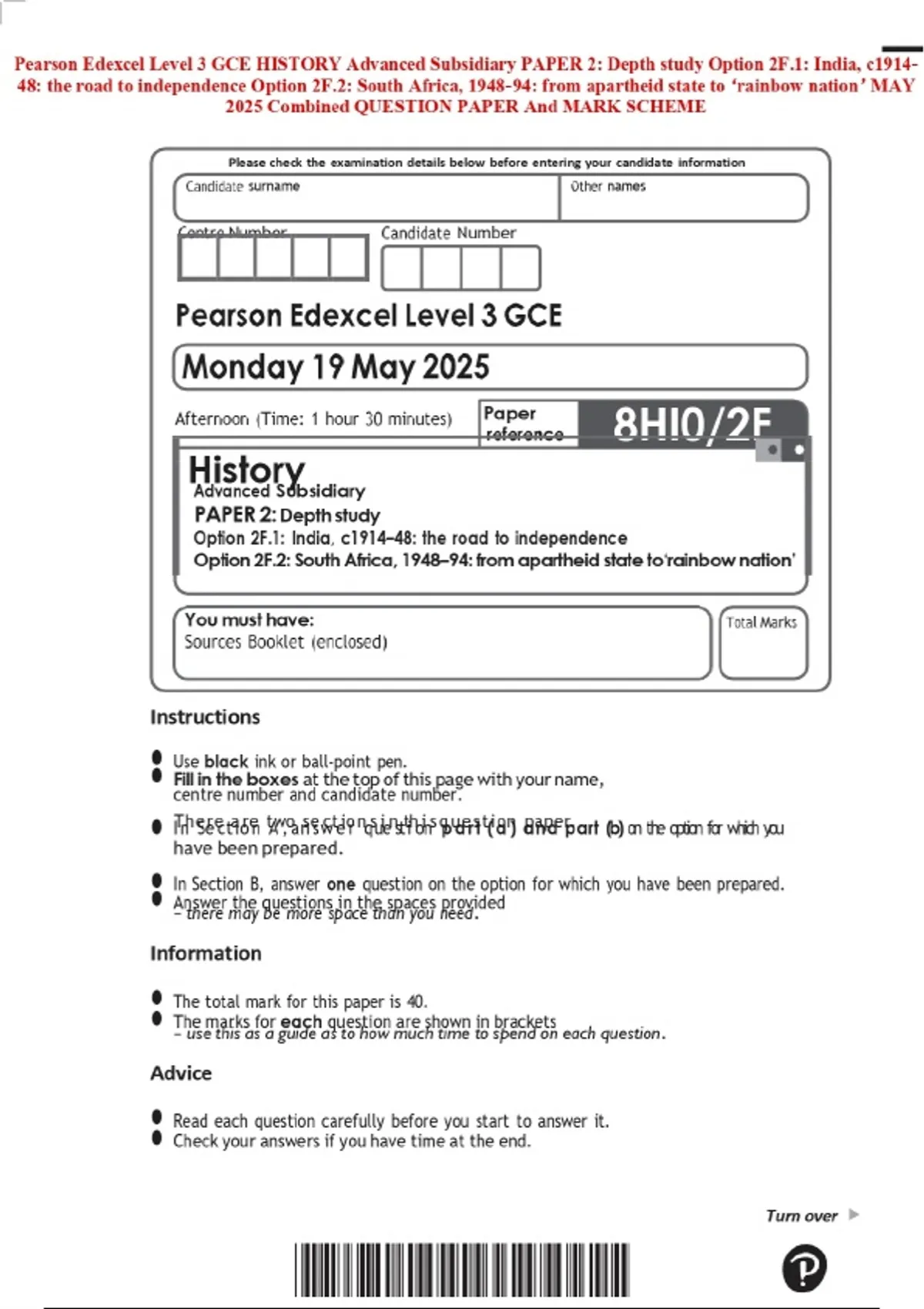 Pearson Edexcel Level 3 GCE HISTORY Advanced Subsidiary PAPER 2: Depth study Option 2F.1: India, c1914– 48: the road to independence Option 2F.2: South Africa, 1948–94: from apartheid state to ‘rainbow nation’ MAY 2025 Combined QUESTION PAPER And MARK SCHEME