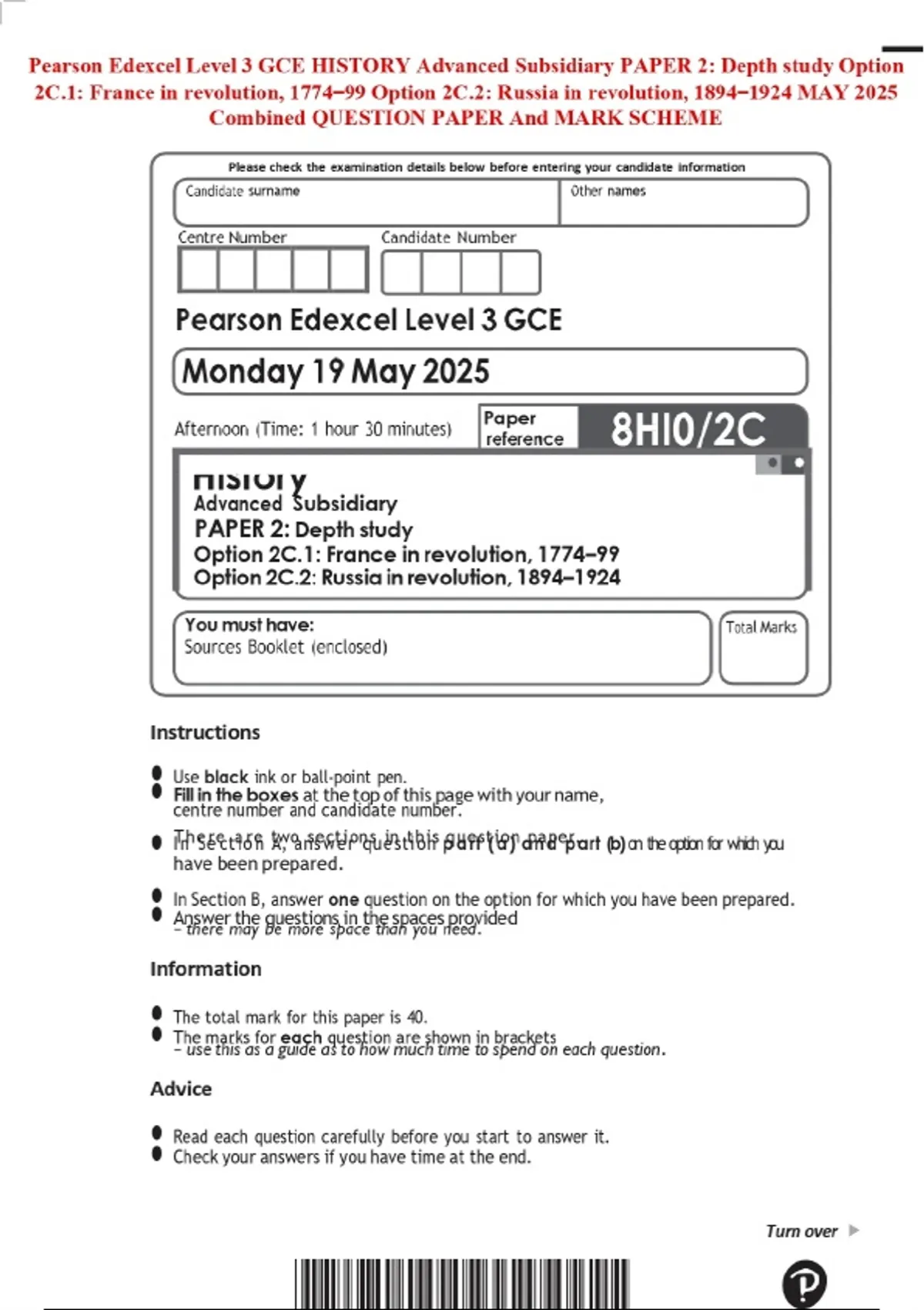 Pearson Edexcel Level 3 GCE HISTORY Advanced Subsidiary PAPER 2: Depth study Option 2C.1: France in revolution, 1774–99 Option 2C.2: Russia in revolution, 1894–1924 MAY 2025 Combined QUESTION PAPER And MARK SCHEME