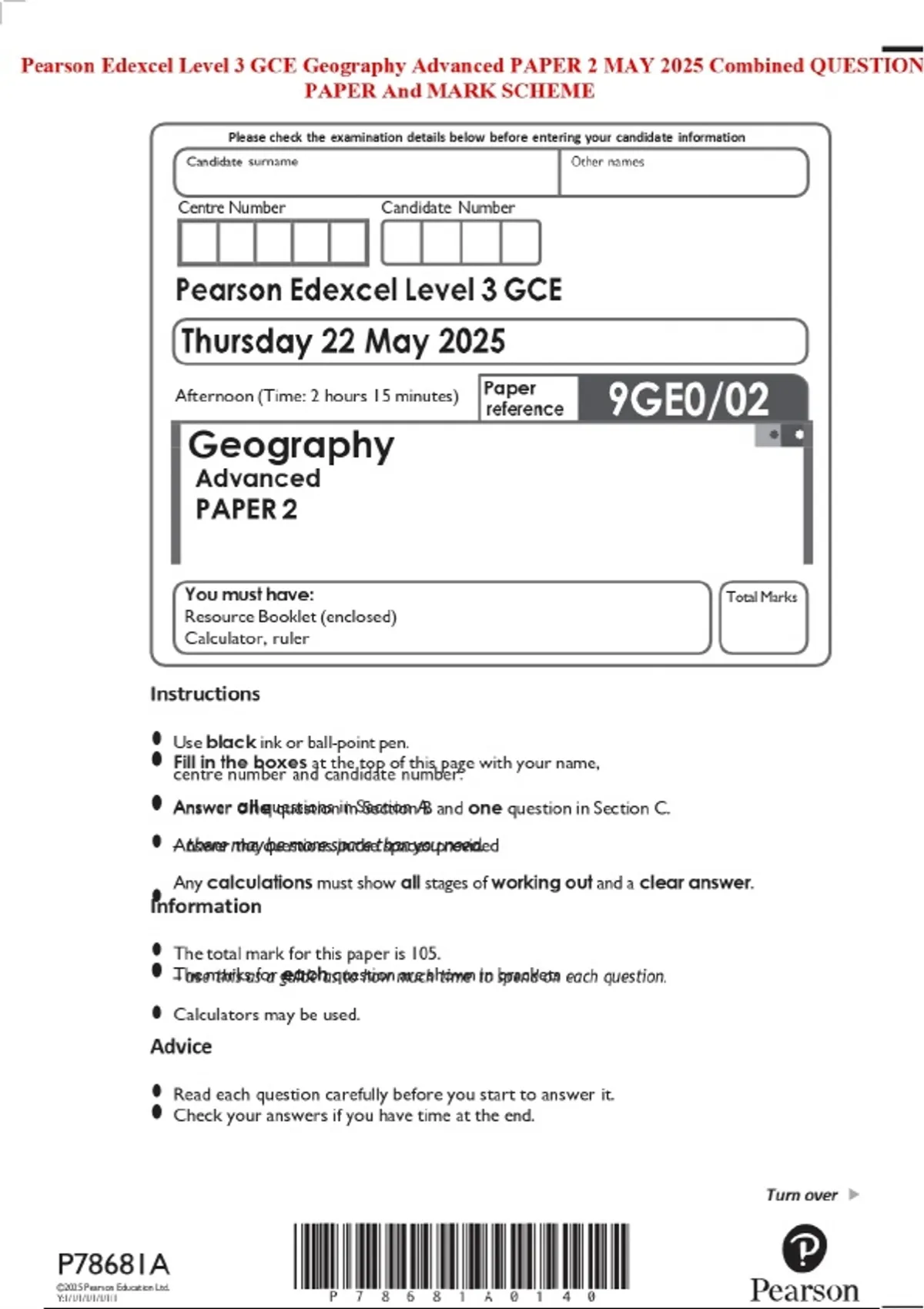 Pearson Edexcel Level 3 GCE Geography Advanced PAPER 2 MAY 2025 Combined QUESTIONPAPER And MARK SCHEME