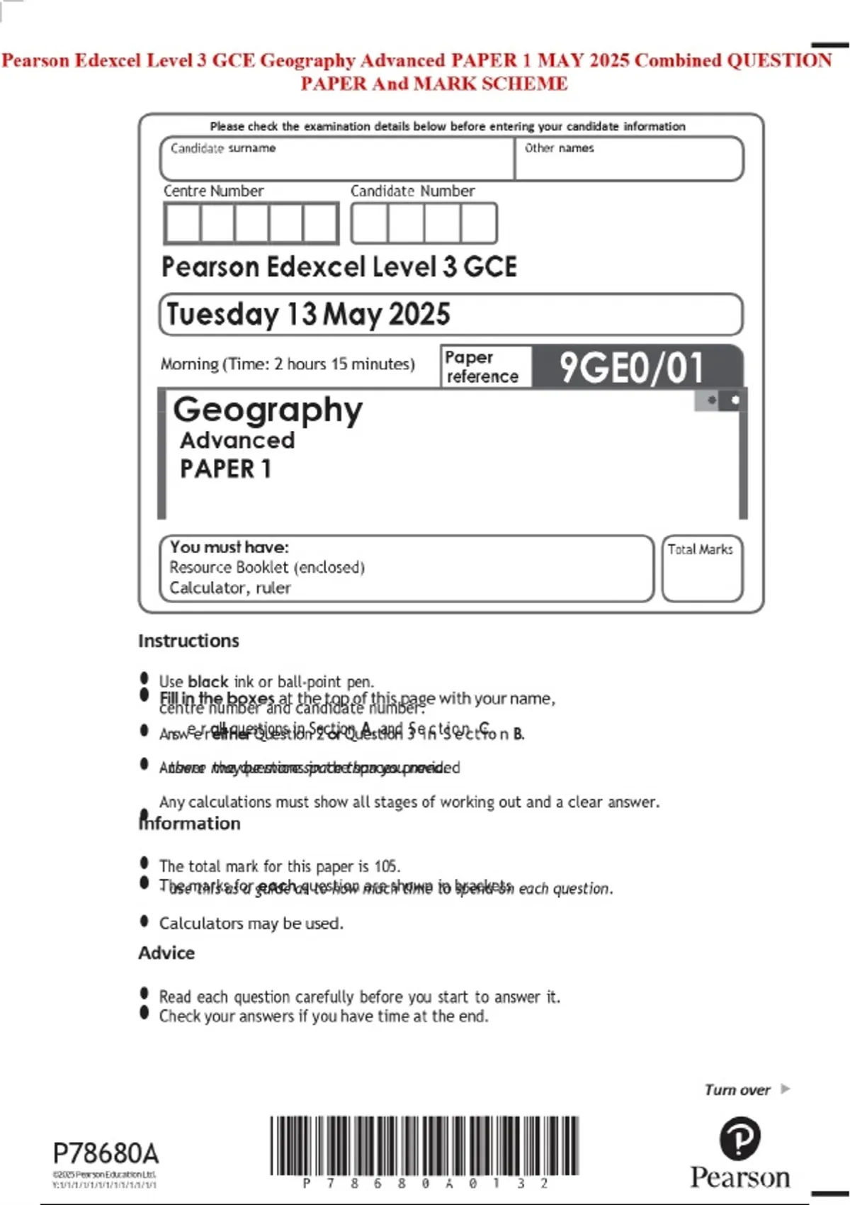 Pearson Edexcel Level 3 GCE Geography Advanced PAPER 1 MAY 2025 Combined QUESTION PAPER And MARK SCHEME