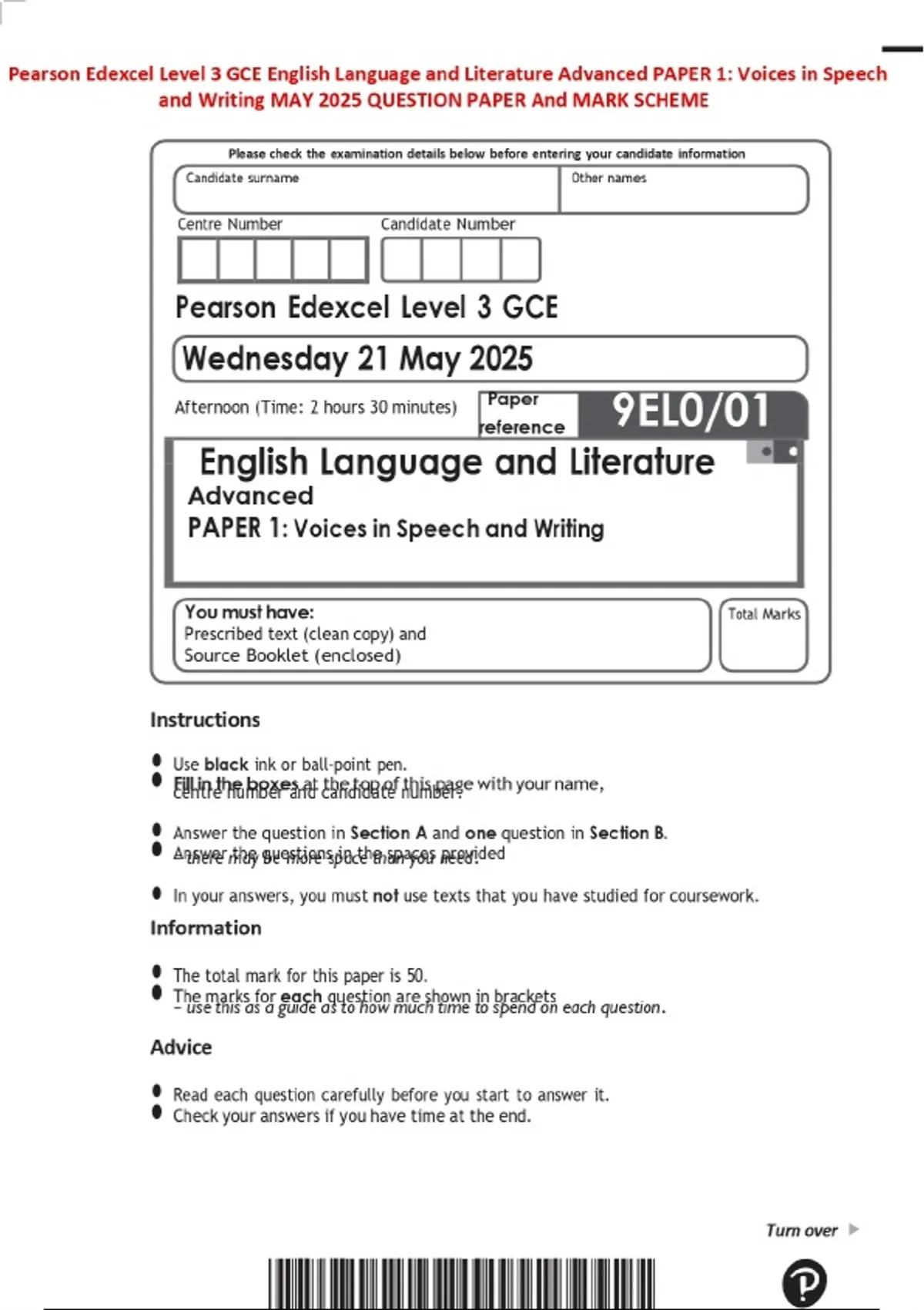 Pearson Edexcel Level 3 GCE English Language and Literature Advanced PAPER 1: Voices in Speech and Writing MAY 2025 QUESTION PAPER And MARK SCHEME