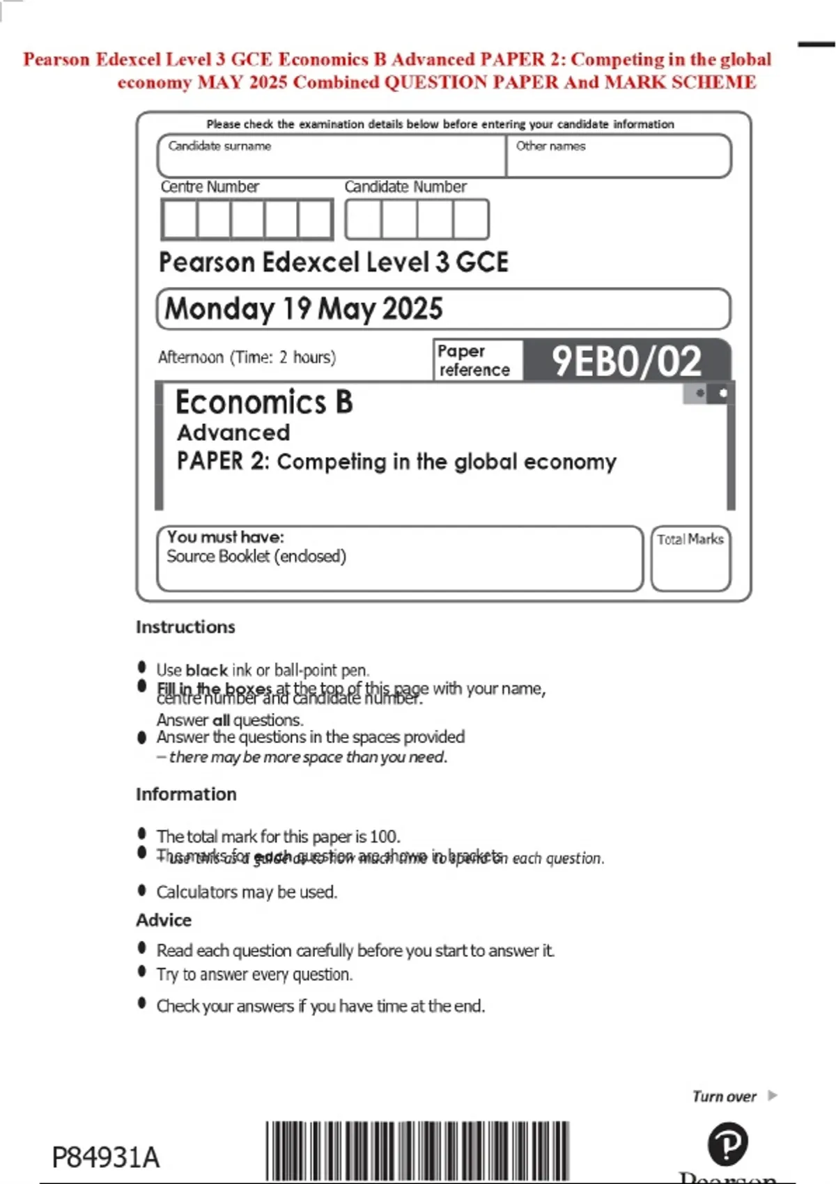 Pearson Edexcel Level 3 GCE Economics B Advanced PAPER 2: Competing in the global economy MAY 2025 Combined QUESTION PAPER And MARK SCHEME