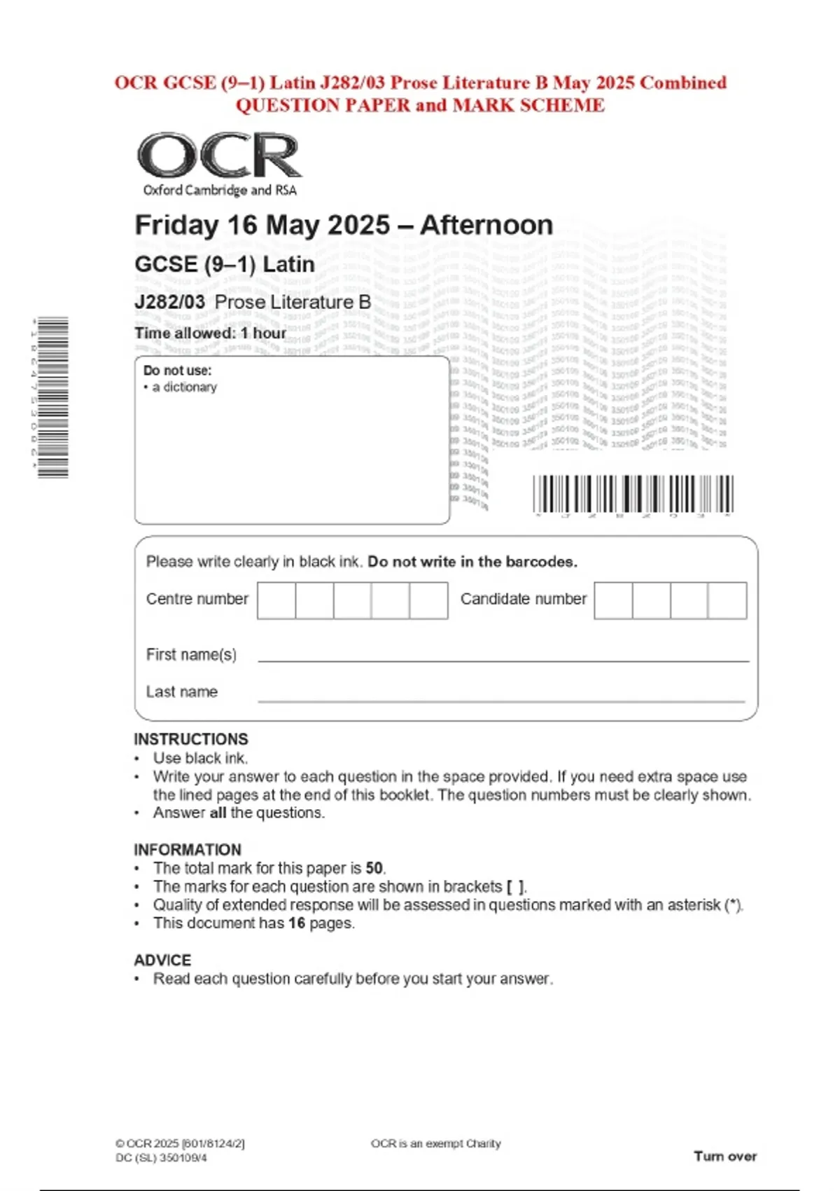 OCR GCSE (9–1) Latin J282/03 Prose Literature B May 2025 Combined QUESTION PAPER and MARK SCHEME