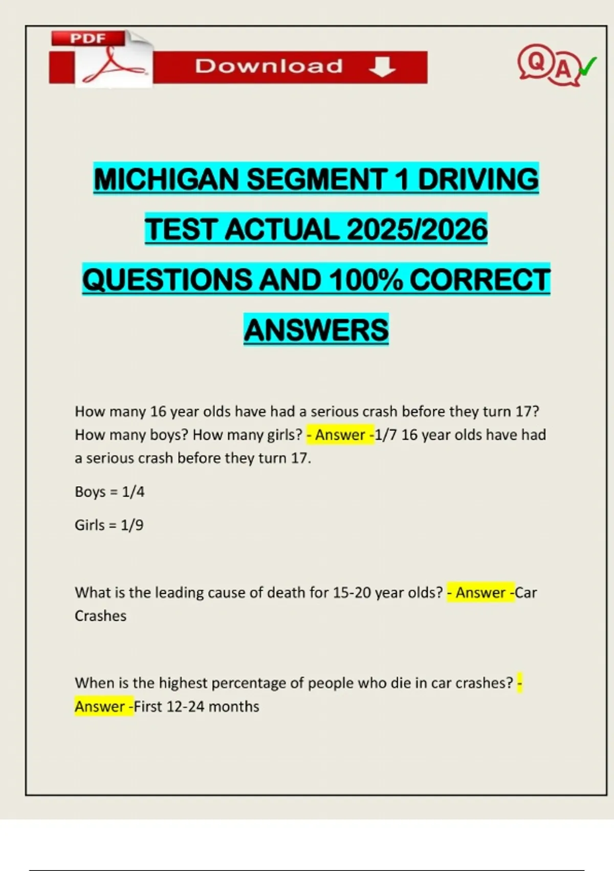 MICHIGAN SEGMENT 1 DRIVING TEST ACTUAL 2025/2026 QUESTIONS AND 100% CORRECT ANSWERS How many 16 year olds have had a serious crash before they turn 17? How many boys? How many girls? - Answer -1/7 16 year olds have had a serious crash before they turn 17. Boys = 1/4 Girls = 1/9 What is the leading cause of death for 15-20 year olds? - Answer -Car Crashes When is the highest percentage of people who die in car crashes? - Answer -First 12-24 months