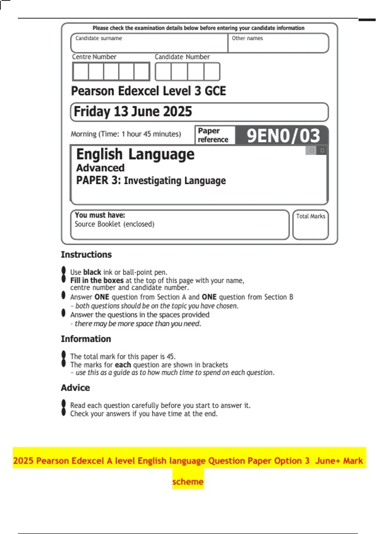 2025 Pearson Edexcel A level English language Question Paper Option 3 June+ Mark