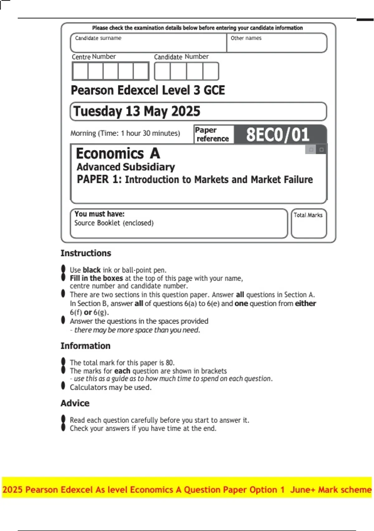 2025 Pearson Edexcel As level Economics A Question Paper Option 1 June + Mark scheme