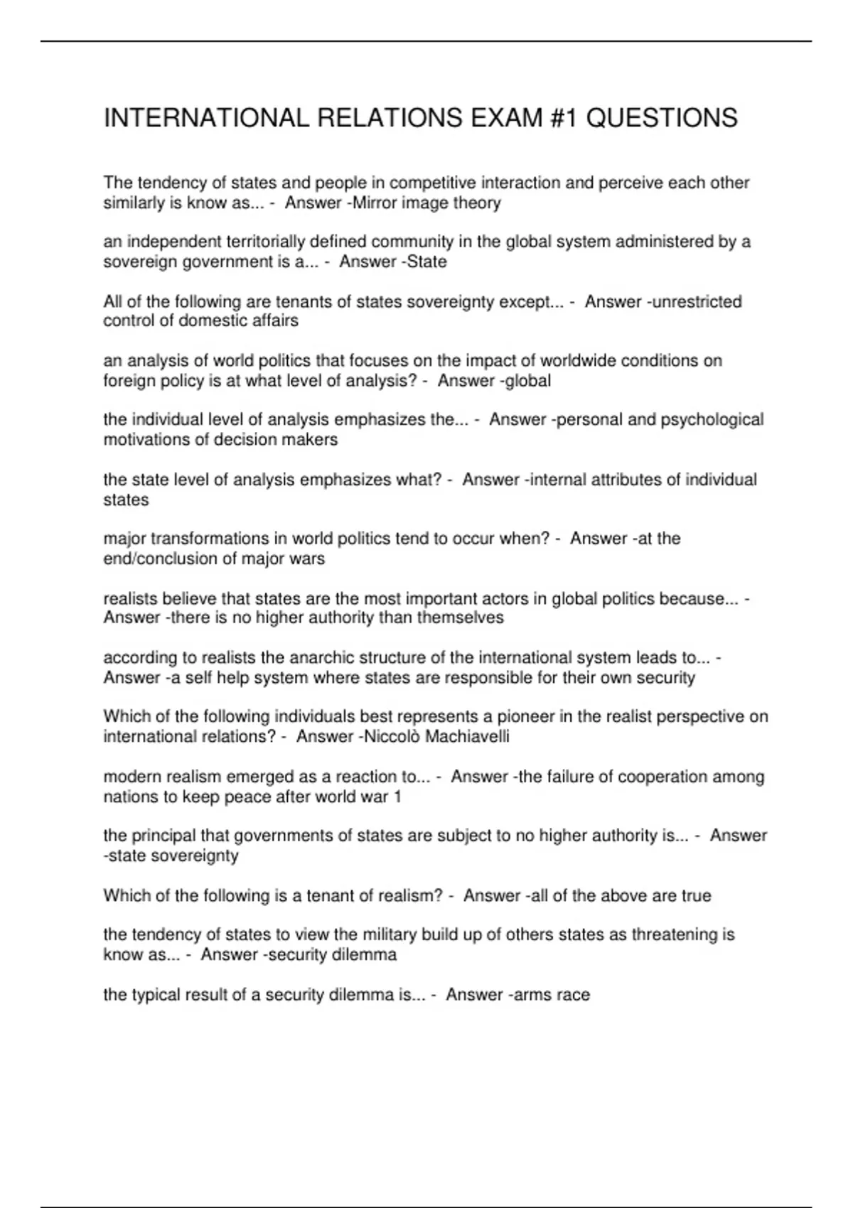 INTERNATIONAL RELATIONS EXAM #1 QUESTIONS