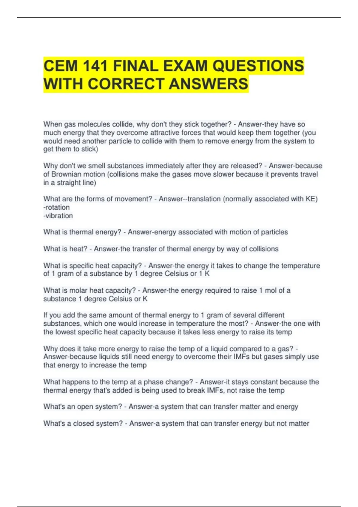 CEM 141 FINAL EXAM QUESTIONS WITH CORRECT ANSWERS