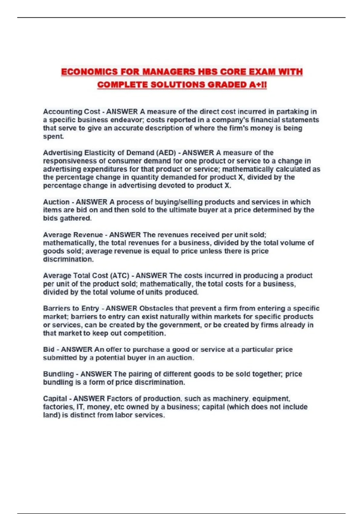 ECONOMICS FOR MANAGERS HBS CORE EXAM WITH COMPLETE SOLUTIONS GRADED A+!!...