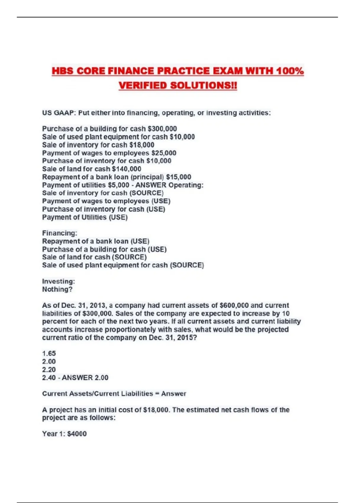 HBS CORE FINANCE PRACTICE EXAM WITH 100% VERIFIED SOLUTIONS!!...