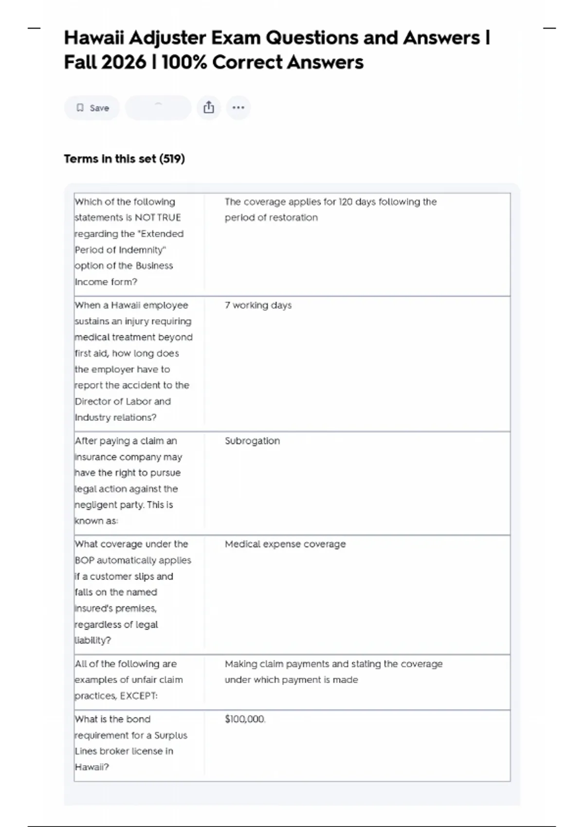 Hawaii Adjuster Exam Questions and Answers | Fall 2026 | 100% Correct Answers
