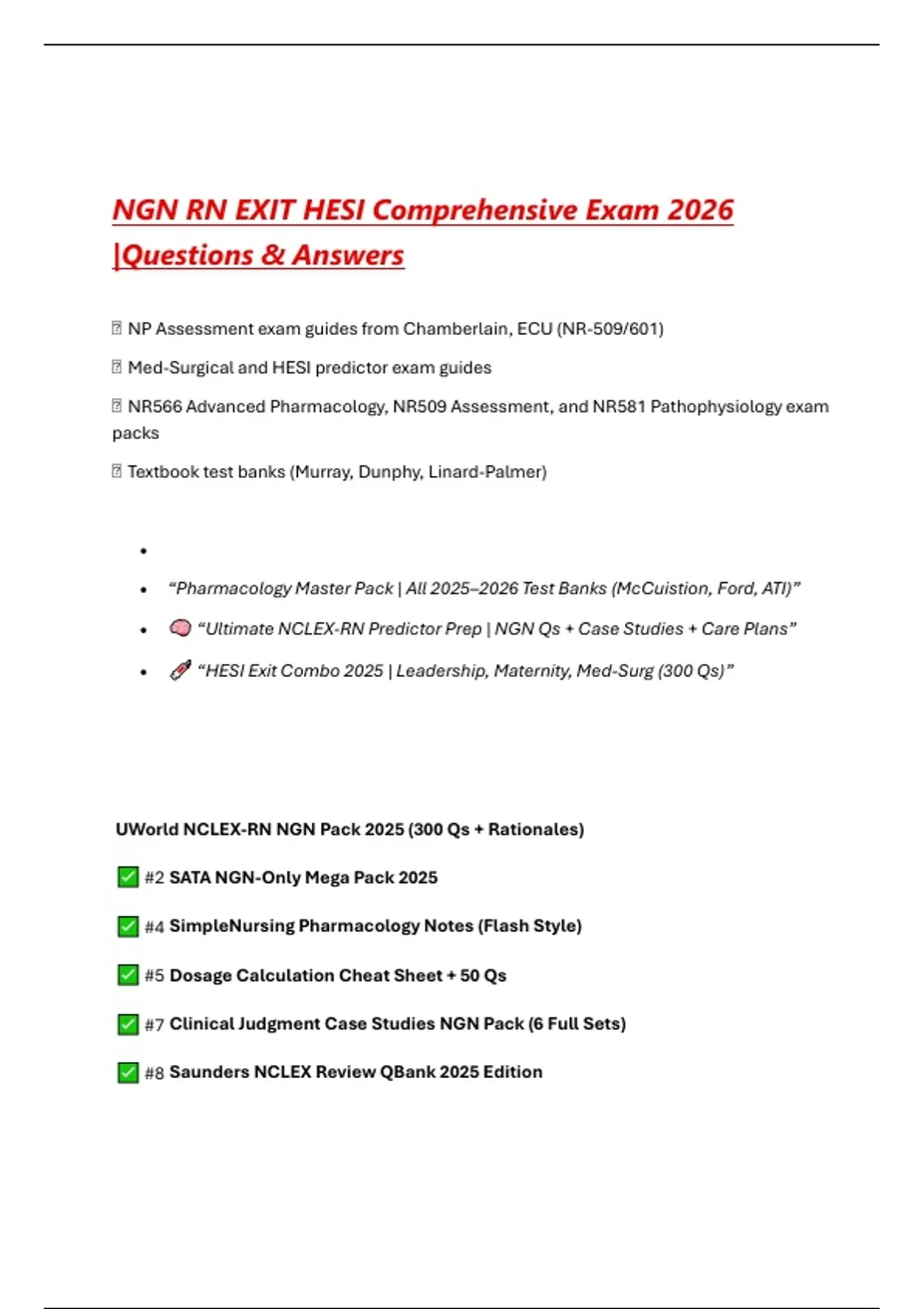 This document contains the full set of NGN-style RN Exit HESI Comprehensive Exam questions and corresponding answers for the 2026 edition. It covers all major nursing domains assessed on the HESI exit exam, including clinical judgment, patient care management, pharmacology, priority setting, and safety. The material reflects updated NGN item formats and provides reliable support for final-year nursing exam preparation.