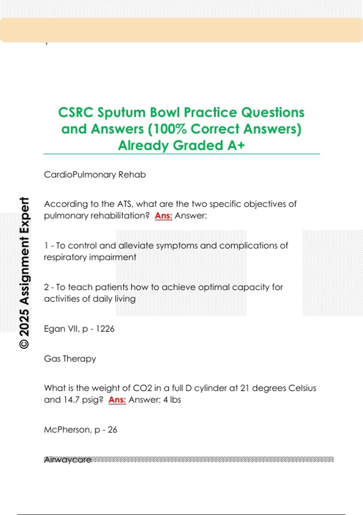 CSRC Sputum Bowl Practice Questions and Answers (100% Correct Answers) Already Graded A+