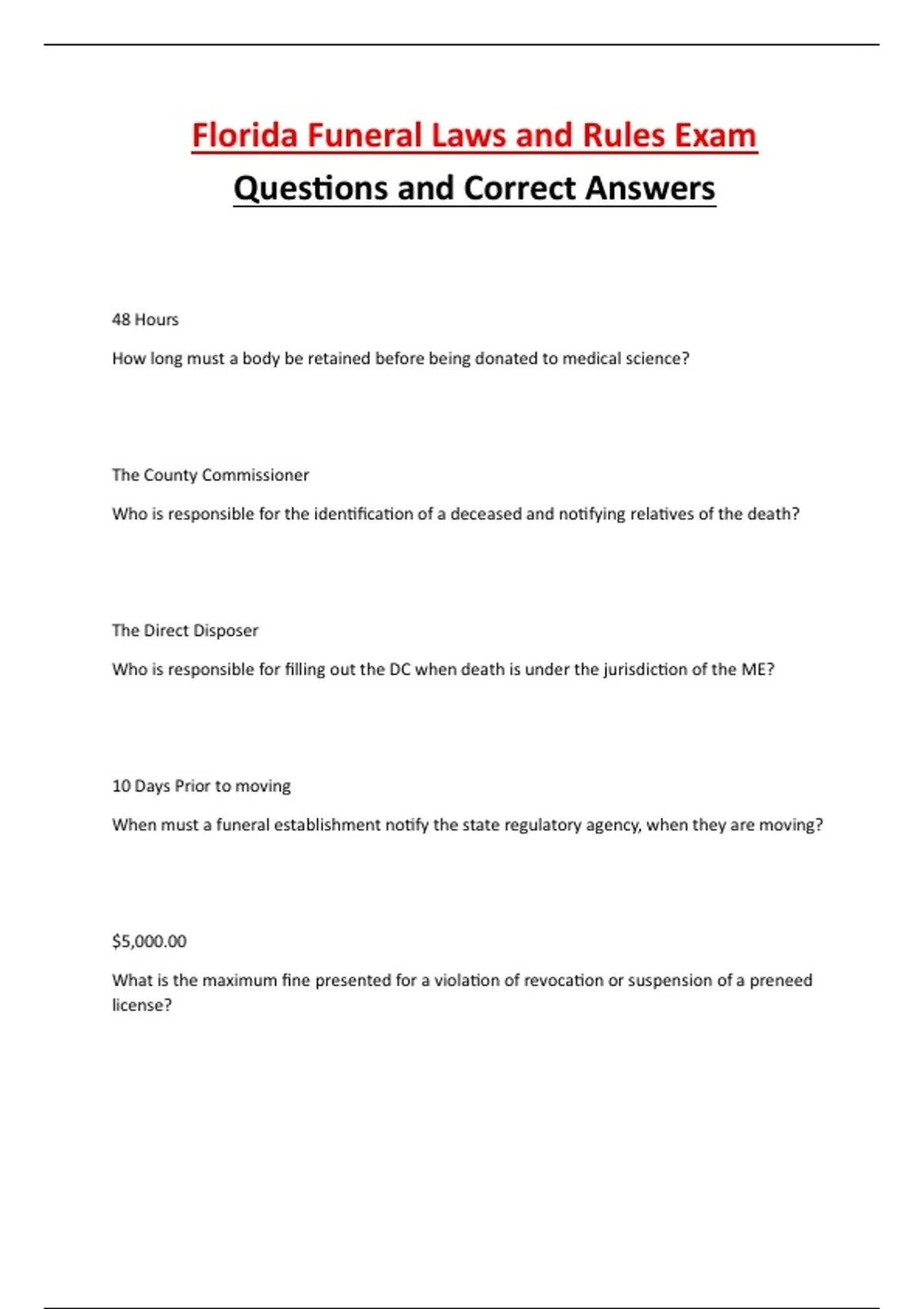 a complete set of questions and correct answers for the Florida Funeral Laws and Rules Exam. It covers all major topics, including medical examiner procedures, death certificate requirements, cemetery regulations, preneed licensing, crematory rules, funeral establishment standards, and legal penalties related to funeral service laws. The material is well-organized and suitable for exam preparation or professional review within Florida’s funeral services industry.