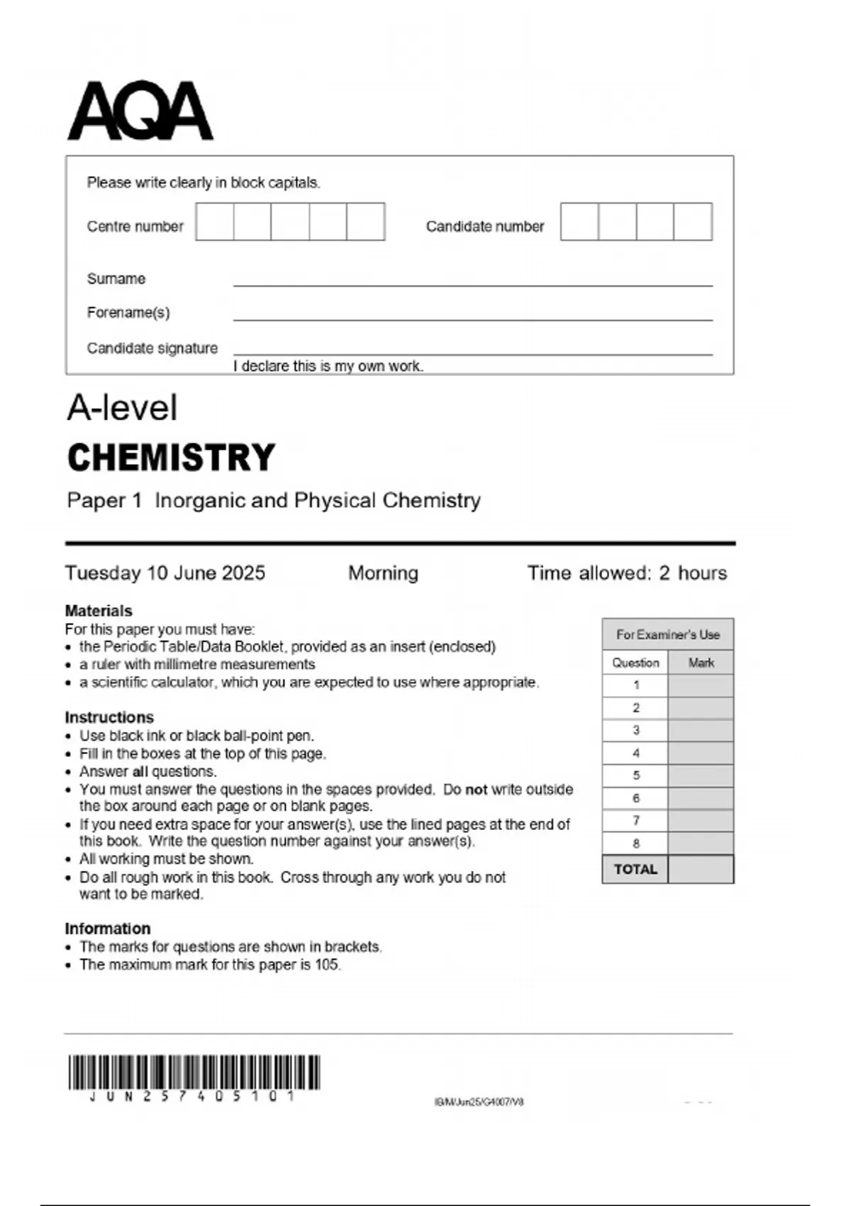 AQA A Level Chemistry Paper 1 2025 Mark Scheme: Official questions