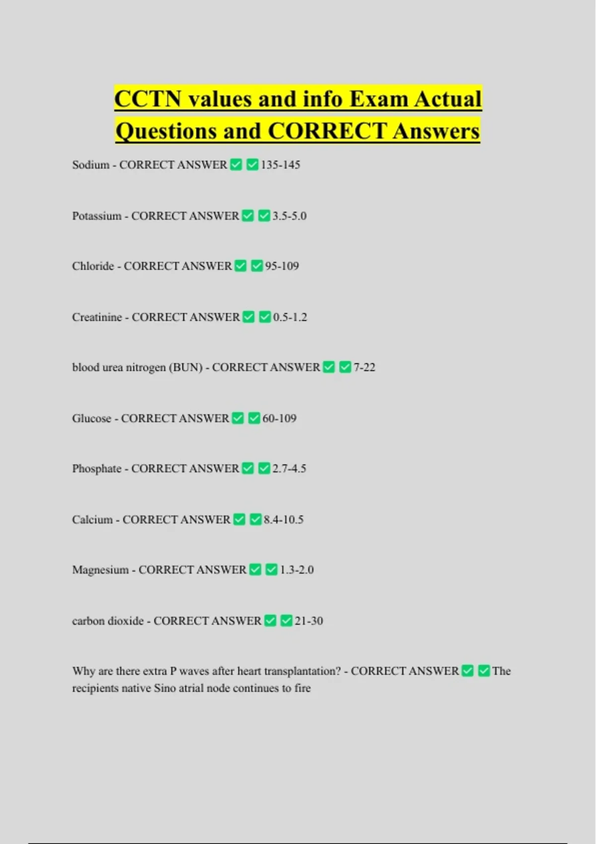 CCTN values and info Exam Actual Questions and CORRECT Answers Sodium - CORRECT ANSWER Potassium - CORRECT ANSWER Chloride - CORRECT ANSWER Creatinine - CORRECT ANSWER 135-145 3.5-5.0 95-109 0.5-1.2 blood urea nitrogen (BUN) - CORRECT ANSWER Glucose - CORRECT ANSWER Phosphate - CORRECT ANSWER Calcium - CORRECT ANSWER Magnesium - CORRECT ANSWER carbon dioxide - CORRECT ANSWER 60-109 2.7-4.5 8.4-10.5 1.3-2.0 21-30 7-22 Why are there extra P waves after heart transplantation? - CORRECT ANSWER recipients native Sino atrial node continues to fire The