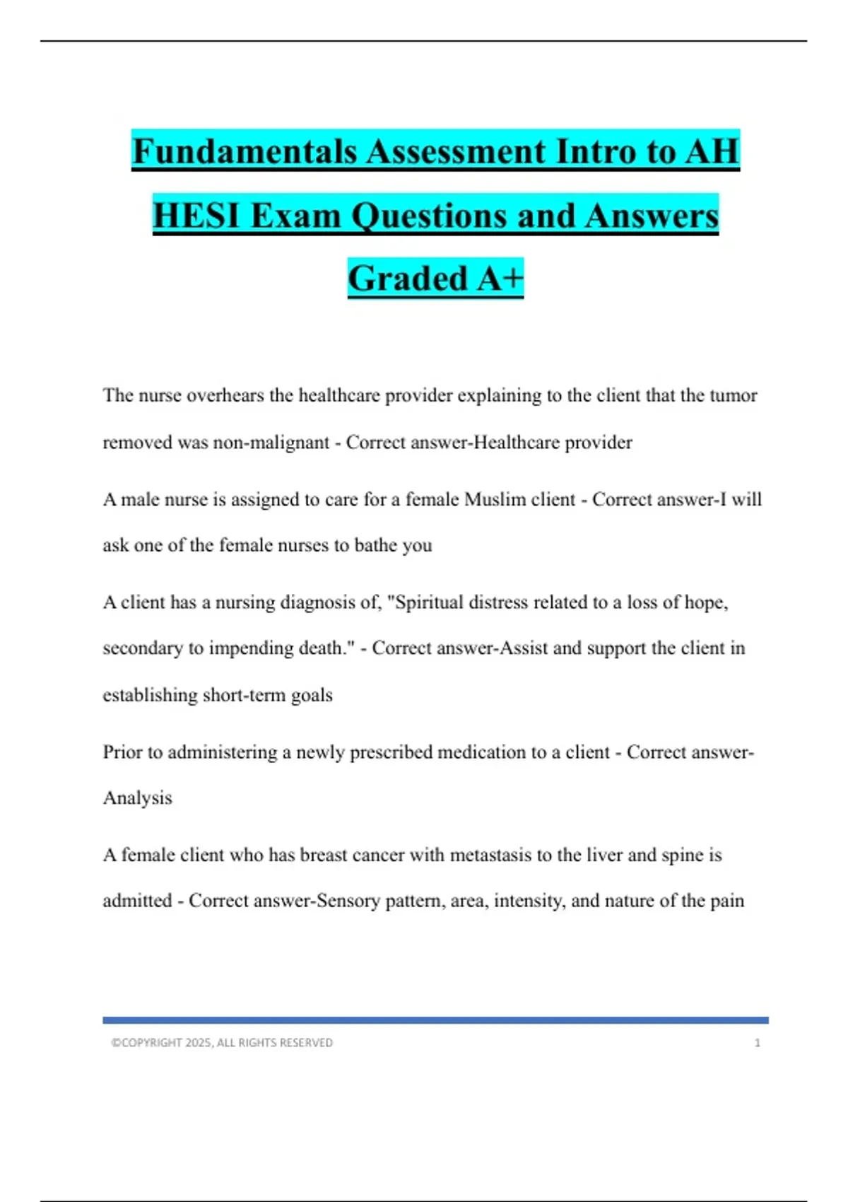 Fundamentals Assessment Intro to AH HESI Exam Questions and Answers Graded A+