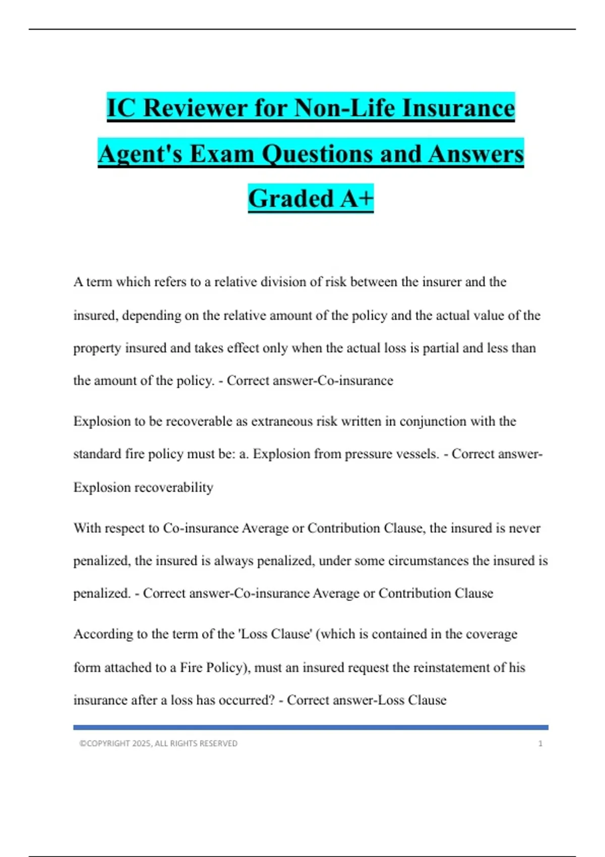IC Reviewer for Non-Life Insurance Agent's Exam Questions and Answers Graded A+