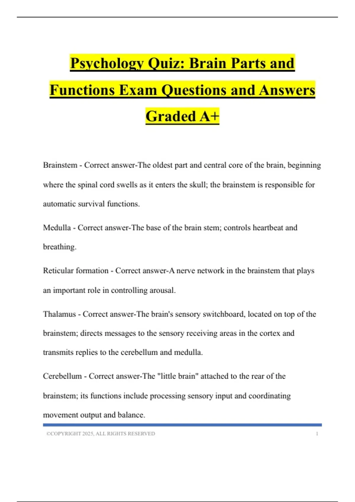 Brainstem - Correct answer-The oldest part and central core of the brain, beginning