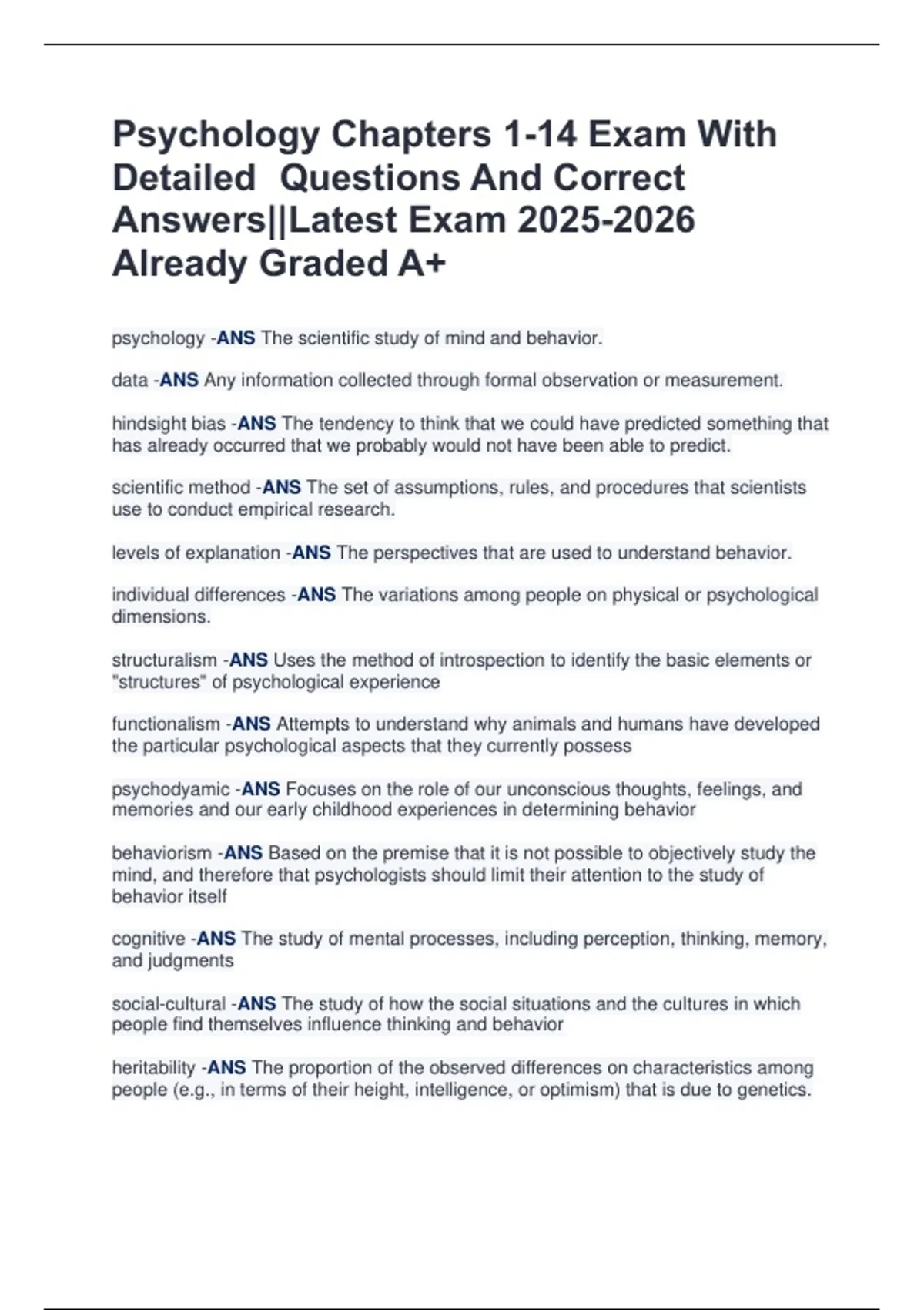 Psychology Chapters 1-14 Exam With Detailed Questions And Correct Answers||Latest Exam Already Graded A+