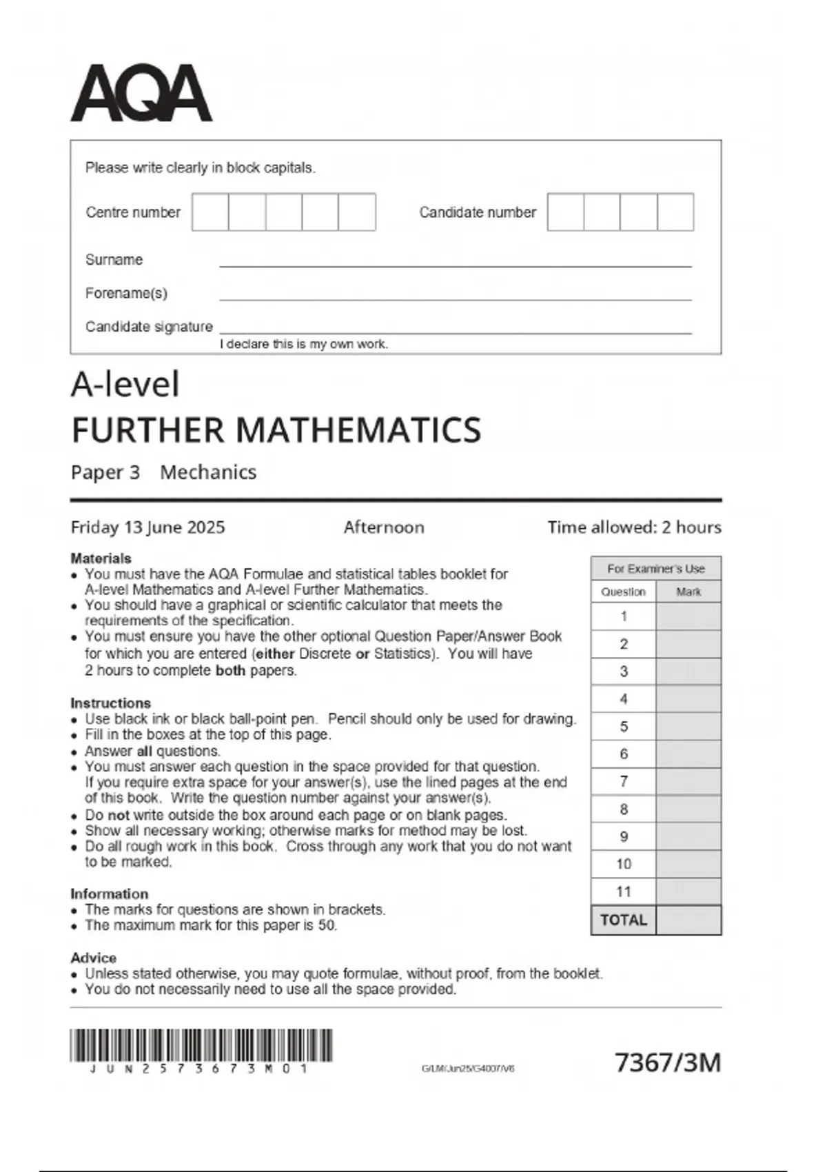 AQA A Level Further Mathematics Paper 3 Mechanics 2025