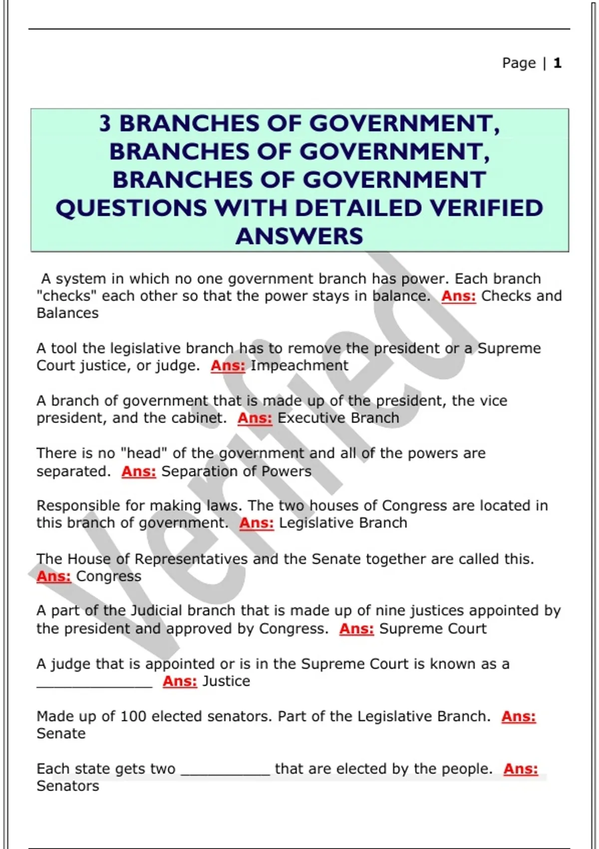 3 BRANCHES OF GOVERNMENT, BRANCHES OF GOVERNMENT, BRANCHES OF GOVERNMENT QUESTIONS WITH DETAILED VERIFIED ANSWERS
