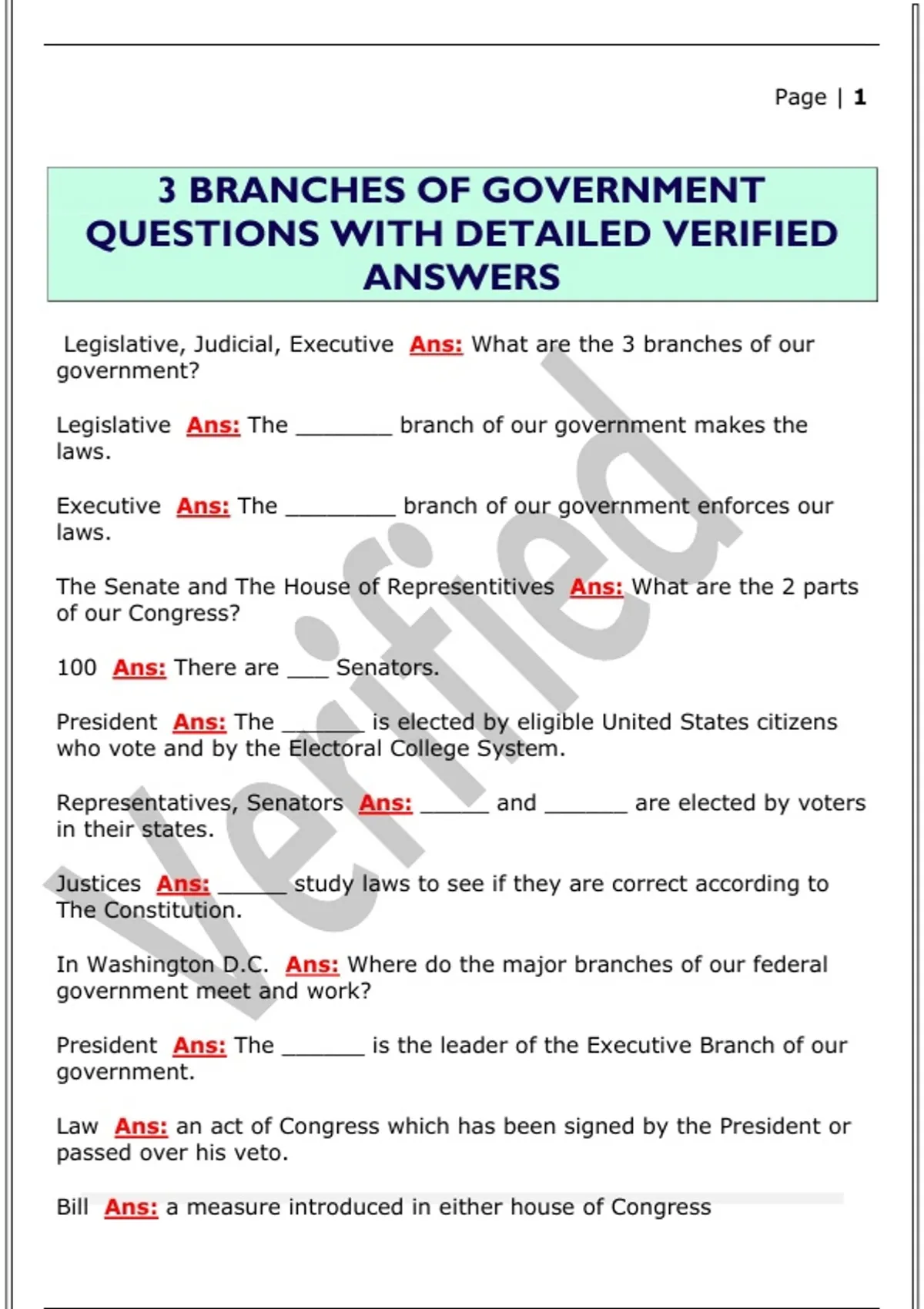 3 BRANCHES OF GOVERNMENT QUESTIONS WITH DETAILED VERIFIED ANSWERS