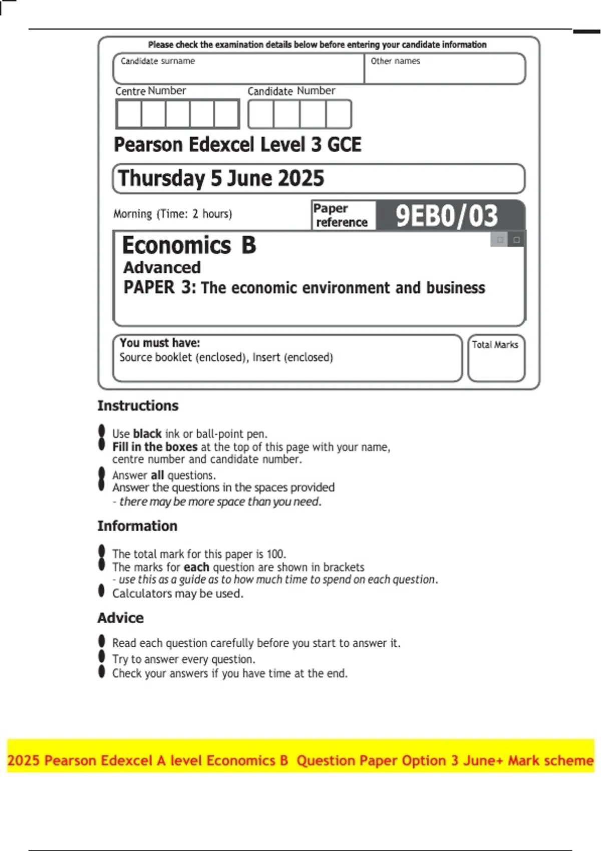 2025 Pearson Edexcel A level Economics B Question Paper Option 3 June + Mark scheme