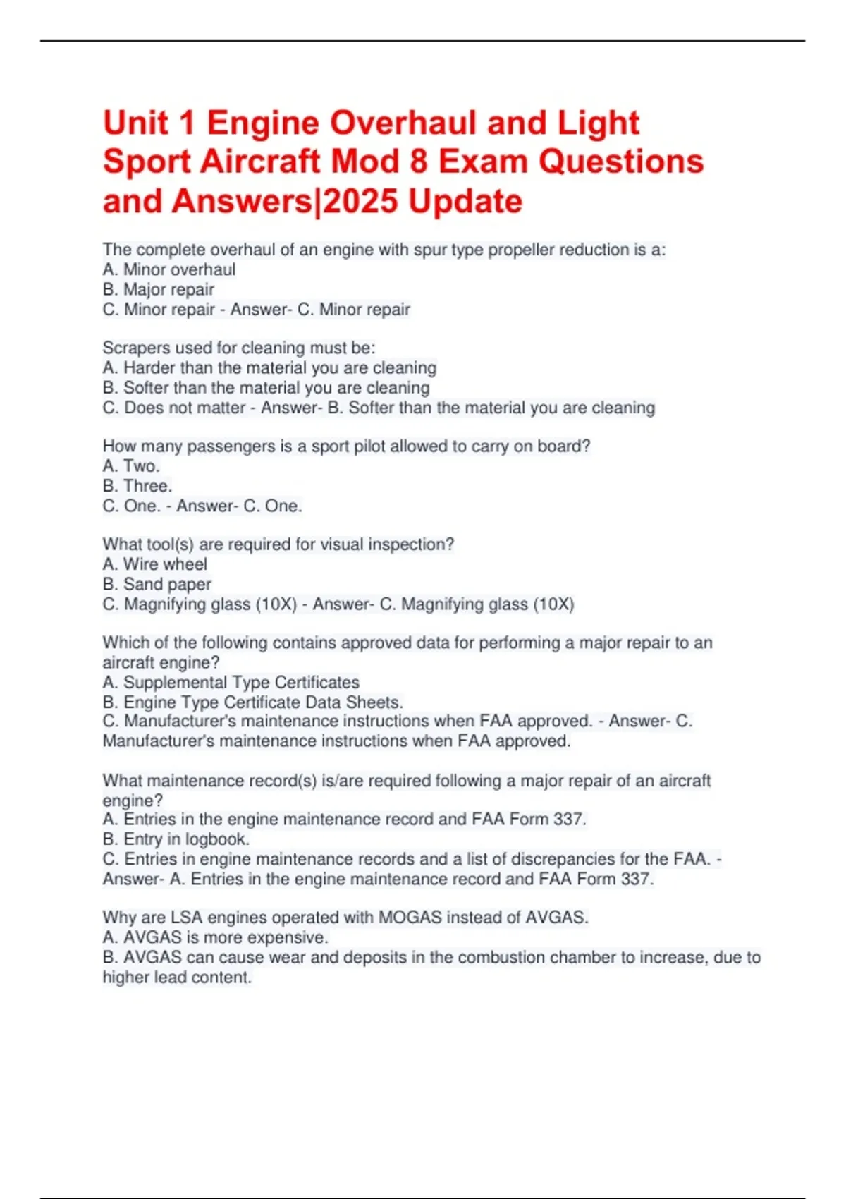 Unit 1 Engine Overhaul and Light Sport Aircraft Mod 8 Exam Questions and Answers|2025 Update The complete overhaul of an engine with spur type propeller reduction is a: A. Minor overhaul B. Major repair C. Minor repair - Answer- C. Minor repair Scrapers used for cleaning must be: A. Harder than the material you are cleaning B. Softer than the material you are cleaning C. Does not matter - Answer- B. Softer than the material you are cleaning How many passengers is a sport pilot allowed to carry on board? A. Two. B. Three. C. One. - Answer- C. One. What tool(s) are required for visual inspection? A. Wire wheel B. Sand paper C. Magnifying glass (10X) - Answer- C. Magnifying glass (10X) Which of the following contains approved data for performing a major repair to an aircraft engine? A. Supplemental Type Certificates B. Engine Type Certificate Data Sheets. C. Manufacturer's maintenance instructions when FAA approved. - Answer- C. Manufacturer's maintenance instructions when FAA approved. What maintenance record(s) is/are required following a major repair of an aircraft engine? A. Entries in the engine maintenance record and FAA Form 337. B. Entry in logbook. C. Entries in engine maintenance records and a list of discrepancies for the FAA. - Answer- A. Entries in the engine maintenance record and FAA Form 337. Why are LSA engines operated with MOGAS instead of AVGAS. A. AVGAS is more expensive. B. AVGAS can cause wear and deposits in the combustion chamber to increase, due to higher lead content. C. AVGAS does not have enough lead. - Answer- B. AVGAS can cause wear and deposits in the combustion chamber to increase, due to higher lead content. What qualifies as a Light Sport Aircraft? A. Maximum takeoff weight of not more than 3,320 pounds B. Maximum takeoff weight of not more than 1,320 pounds C. Maximum takeoff weight of not more than 2,320 pounds - Answer- B. Maximum takeoff weight of not more than 1,320 pounds When must an Airworthiness Directive (AD) be complied with after it becomes effective? A. At the next scheduled overhaul. B. As specified in the AD. C. During the next scheduled inspection. - Answer- B. As specified in the AD. Who is responsible for determining if an aircraft is in condition for safe flight? A. The FAA. B. A certificated aircraft mechanic. C. The pilot in command. - Answer- C. The pilot in command. Two-stroke engines are planned to run on an oil/gasoline mixture of : A. 1:50. B. 1:150. C. 1:500. - Answer- A. 1:50. The holder of a repairman certificate with a light-sport aircraft rating. A. They may perform maintenance and preventive maintenance on light-sport aircraft . B. They may perform modifications on light-sport aircraft . C. They may perform overhauls on light-sport aircraft . - Answer- A. They may perform maintenance and preventive maintenance on light-sport aircraft . Who can return to service the complete overhaul of a Lycoming GSIO-480 engine? A. A powerplant mechanic. B. An A&P mechanic. C. An A&P mechanic with an IA. - Answer- C. An A&P mechanic with an IA. Which of the following can inspect and approve an engine major repair for return to service? A. Certificated mechanic with a powerplant rating. B. Certificated mechanic with airframe and powerplant ratings. C. Certificated mechanic with inspection authorization - Answer- C. Certificated mechanic with inspection authorization The complete overhaul of a Lycoming GSIO-480 engine is a: A. Minor repair. B. Minor overhaul. C. Major repair. - Answer- C. Major repair. Welding of an aircraft structural part is: A. A minor alteration. B. A major repair. C. A minor repair. - Answer- B. A major repair.