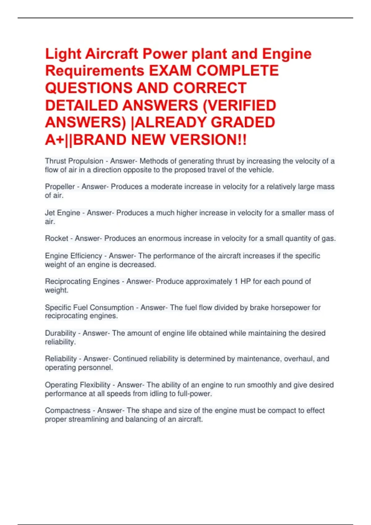 Light Aircraft Power plant and Engine Requirements EXAM COMPLETE QUESTIONS AND CORRECT DETAILED ANSWERS (VERIFIED ANSWERS) |ALREADY GRADED A+||BRAND NEW VERSION!!