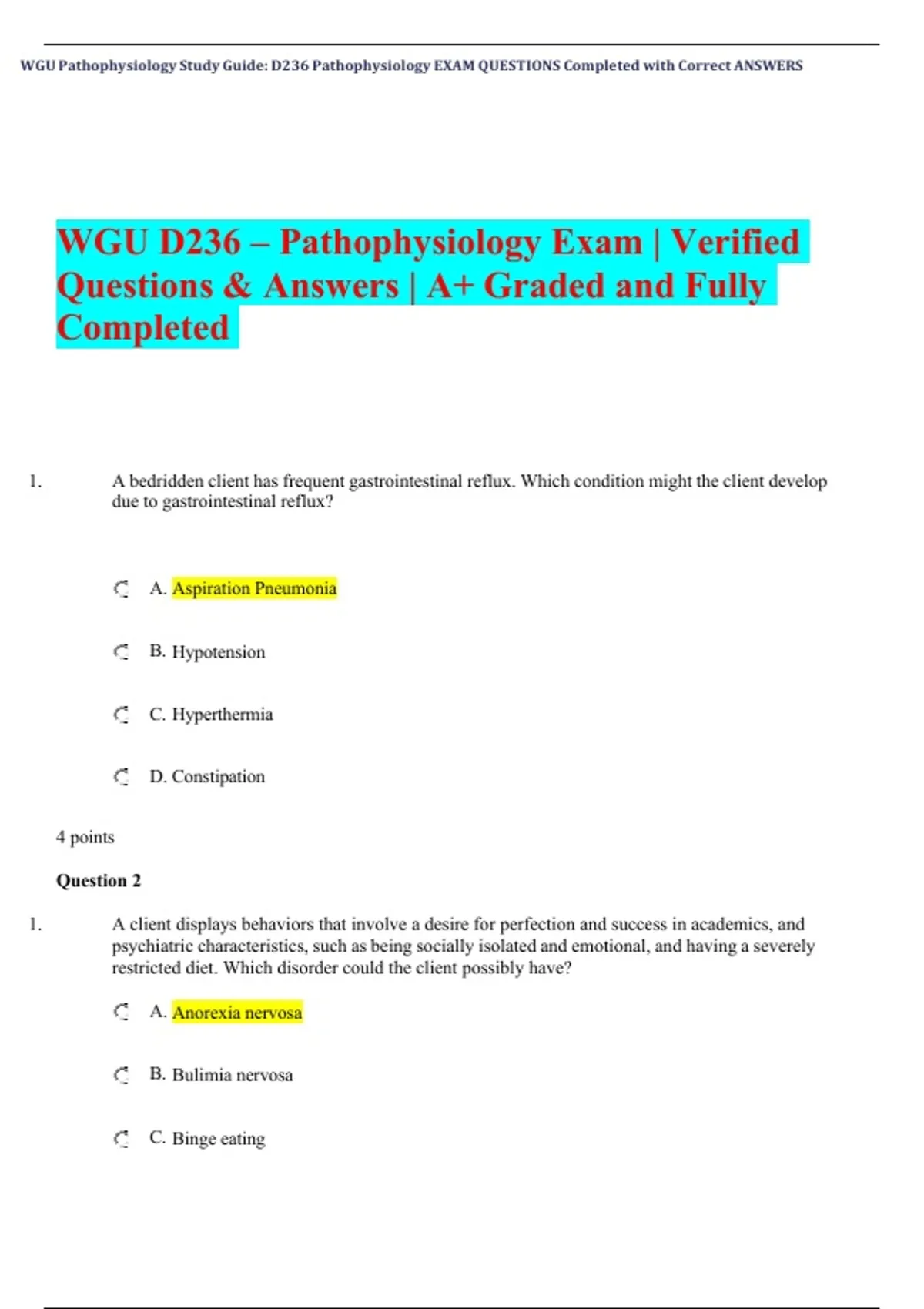 , WGU Pathophysiology Study Guide: D236 Pathophysiology EXAM QUESTIONS Completed with Correct ANSWERS