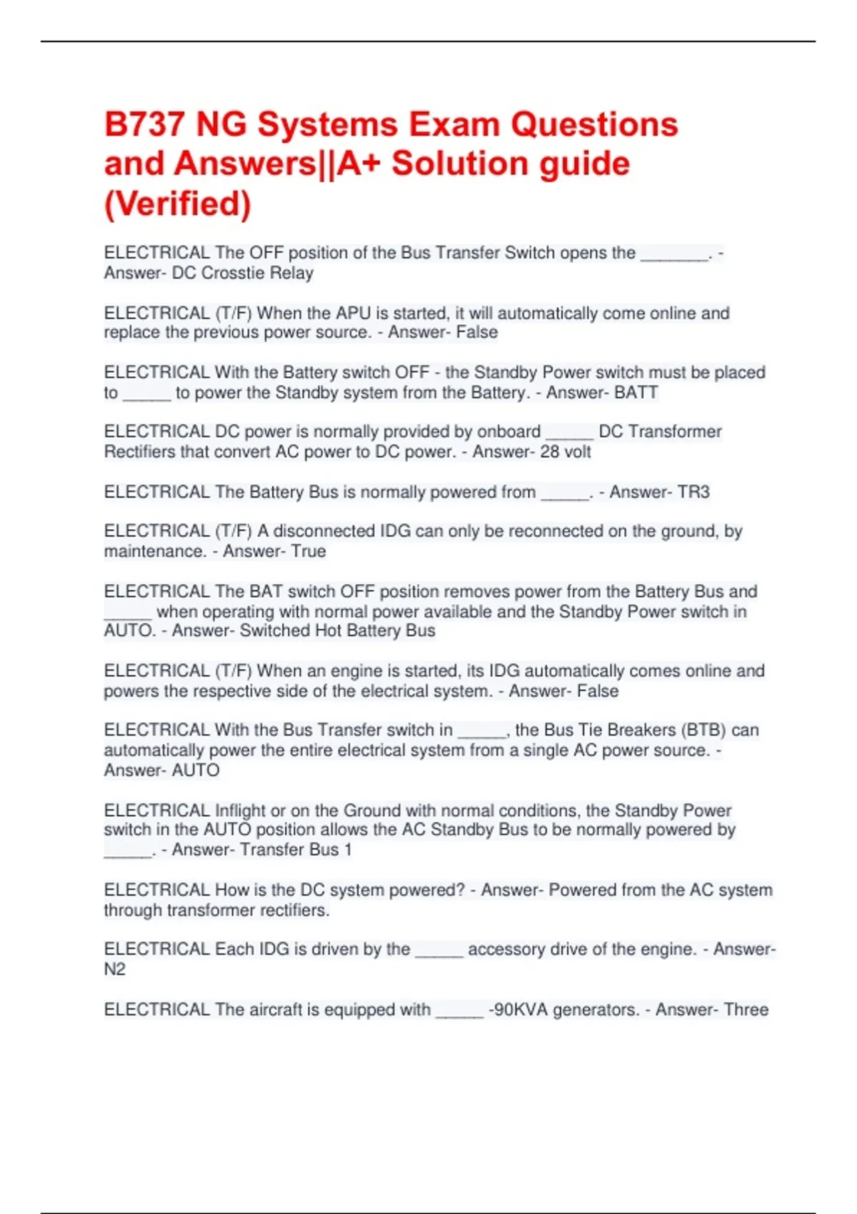 B737 NG Systems Exam Questions and Answers||A+ Solution guide (Verified) ELECTRICAL The OFF position of the Bus Transfer Switch opens the _______. - Answer- DC Crosstie Relay ELECTRICAL (T/F) When the APU is started, it will automatically come online and replace the previous power source. - Answer- False ELECTRICAL With the Battery switch OFF - the Standby Power switch must be placed to _____ to power the Standby system from the Battery. - Answer- BATT ELECTRICAL DC power is normally provided by onboard _____ DC Transformer Rectifiers that convert AC power to DC power. - Answer- 28 volt ELECTRICAL The Battery Bus is normally powered from _____. - Answer- TR3 ELECTRICAL (T/F) A disconnected IDG can only be reconnected on the ground, by maintenance. - Answer- True ELECTRICAL The BAT switch OFF position removes power from the Battery Bus and _____ when operating with normal power available and the Standby Power switch in AUTO. - Answer- Switched Hot Battery Bus ELECTRICAL (T/F) When an engine is started, its IDG automatically comes online and powers the respective side of the electrical system. - Answer- False ELECTRICAL With the Bus Transfer switch in _____, the Bus Tie Breakers (BTB) can automatically power the entire electrical system from a single AC power source. - Answer- AUTO ELECTRICAL Inflight or on the Ground with normal conditions, the Standby Power switch in the AUTO position allows the AC Standby Bus to be normally powered by _____. - Answer- Transfer Bus 1 ELECTRICAL How is the DC system powered? - Answer- Powered from the AC system through transformer rectifiers. ELECTRICAL Each IDG is driven by the _____ accessory drive of the engine. - Answer- N2 ELECTRICAL The aircraft is equipped with _____ -90KVA generators. - Answer- Three ELECTRICAL In case of an overload condition, the galley power on _____ is shed first. - Answer- Transfer Bus 2 ELECTRICAL (T/F) If an overload exists after shedding of galley power, Main Bus 1 and Main Bus 2 are shed. - Answer- True ELECTRICAL (T/F) There is never a time that two generators are allowed to power the same Transfer Bus. - Answer- True ELECTRICAL The normally closed Cross Bus Tie relay opens when the autoflight Approach mode captures the _____ with the Flight Director or Autopilot in use. - Answer- Glideslope ELECTRICAL (T/F) The aircraft battery can not provide power to AC components. - Answer- False POWERPLANT (T/F) The primary airflow continues to flow normally during reverse operations. - Answer- True POWERPLANT An amber ENG FAIL alert appears on the EGT display if the N2 rpm falls below _____ with the start lever in idle. - Answer- 50% POWERPLANT The starter is _____ operated. - Answer- Pneumatically POWERPLANT When engine reverse thrust is selected, an _____ REV appears above the N1 digital display box while the reverser is in transit. - Answer- Amber POWERPLANT Low oil pressure (below approximately 13 psi) causes the illumination of the associated _____ LOW OIL PRESSURE annunciator on the Upper DU. - Answer- Amber POWERPLANT The EGT display changes from white to amber if the maximum continuous EGT is exceeded for more than _____. - Answer- Five minutes POWERPLANT The lights for the engine fuel shutoff valve and the spar shutoff valve appear _____ when the valves are closed. - Answer- Dim blue POWERPLANT The _____ is the free spool, while the _____ is the driven spool that is connected (by gears) to the accessory section. - Answer- N1; N2 POWERPLANT The ignition _____ position is used for takeoff, landing, flight in precipitation, and engine operation in icing conditions. - Answer- CONT POWERPLANT The N1 dial, pointer, and digital display turn _____ if the max operating N1 rpm is exceeded. - Answer- Red